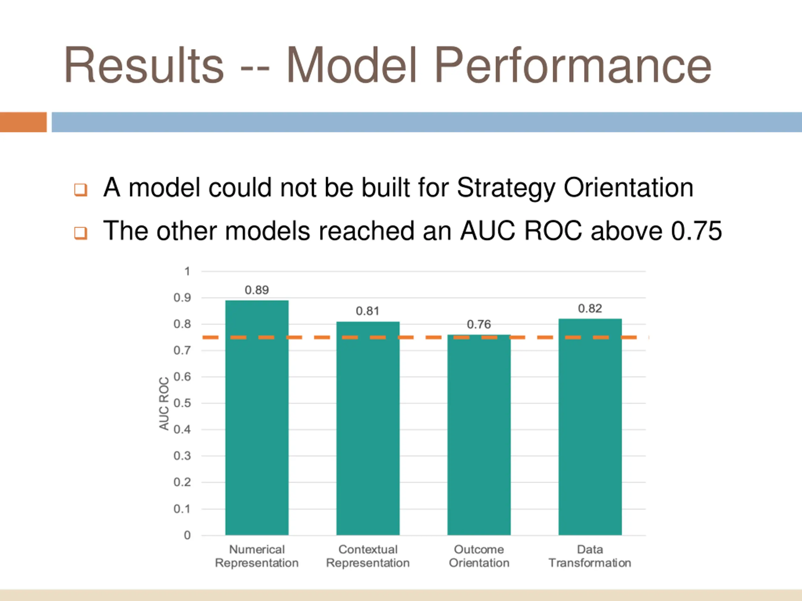 Results -- Model Performance A model could not be built for Strategy Orientation The other models reached an AUC ROC above 0.75