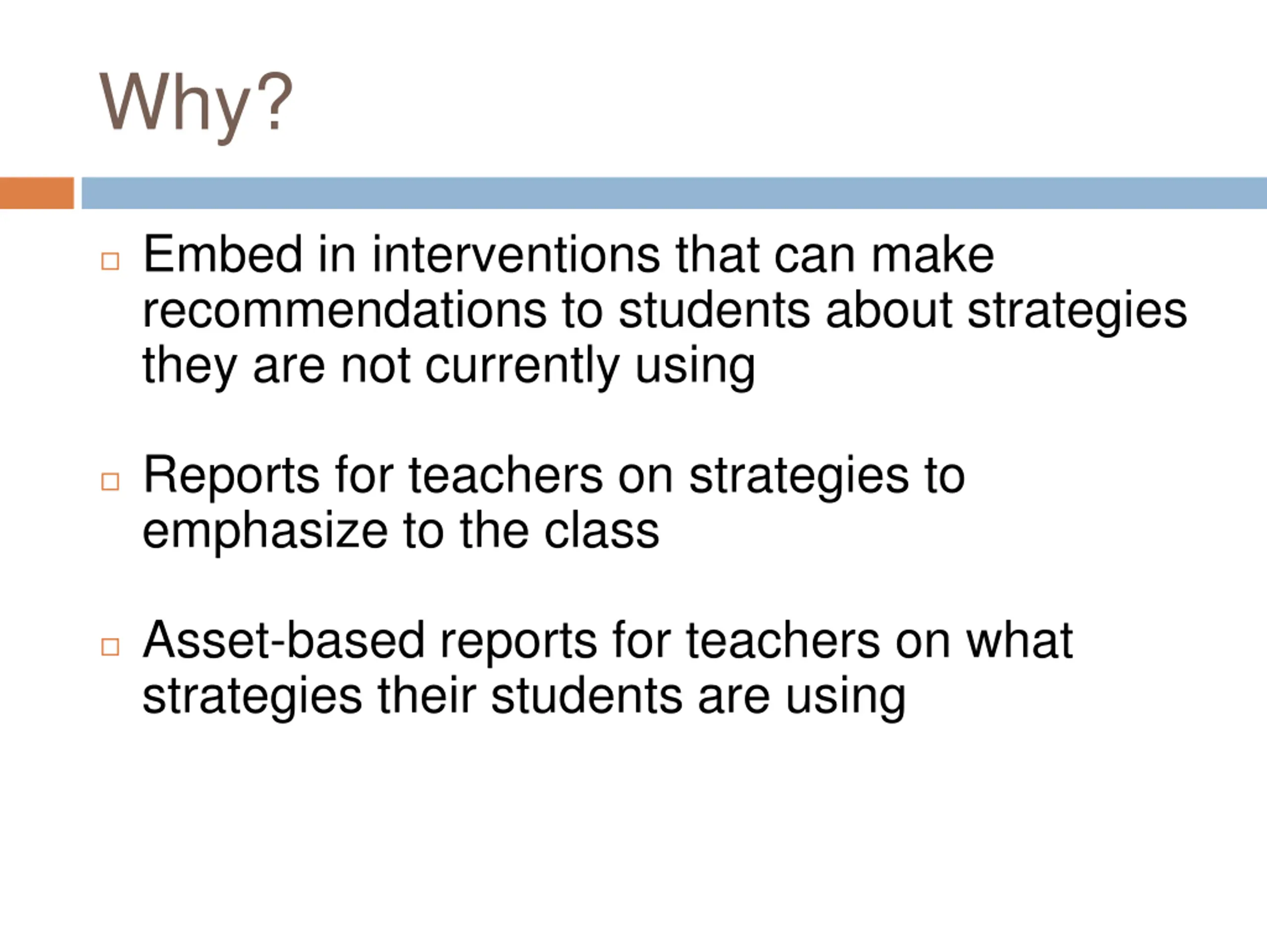 Why? Embed in interventions that can make recommendations to students about strategies they are not currently using Reports for teachers on strategies to emphasize to the class Asset-based reports for teachers on what strategies their students are using