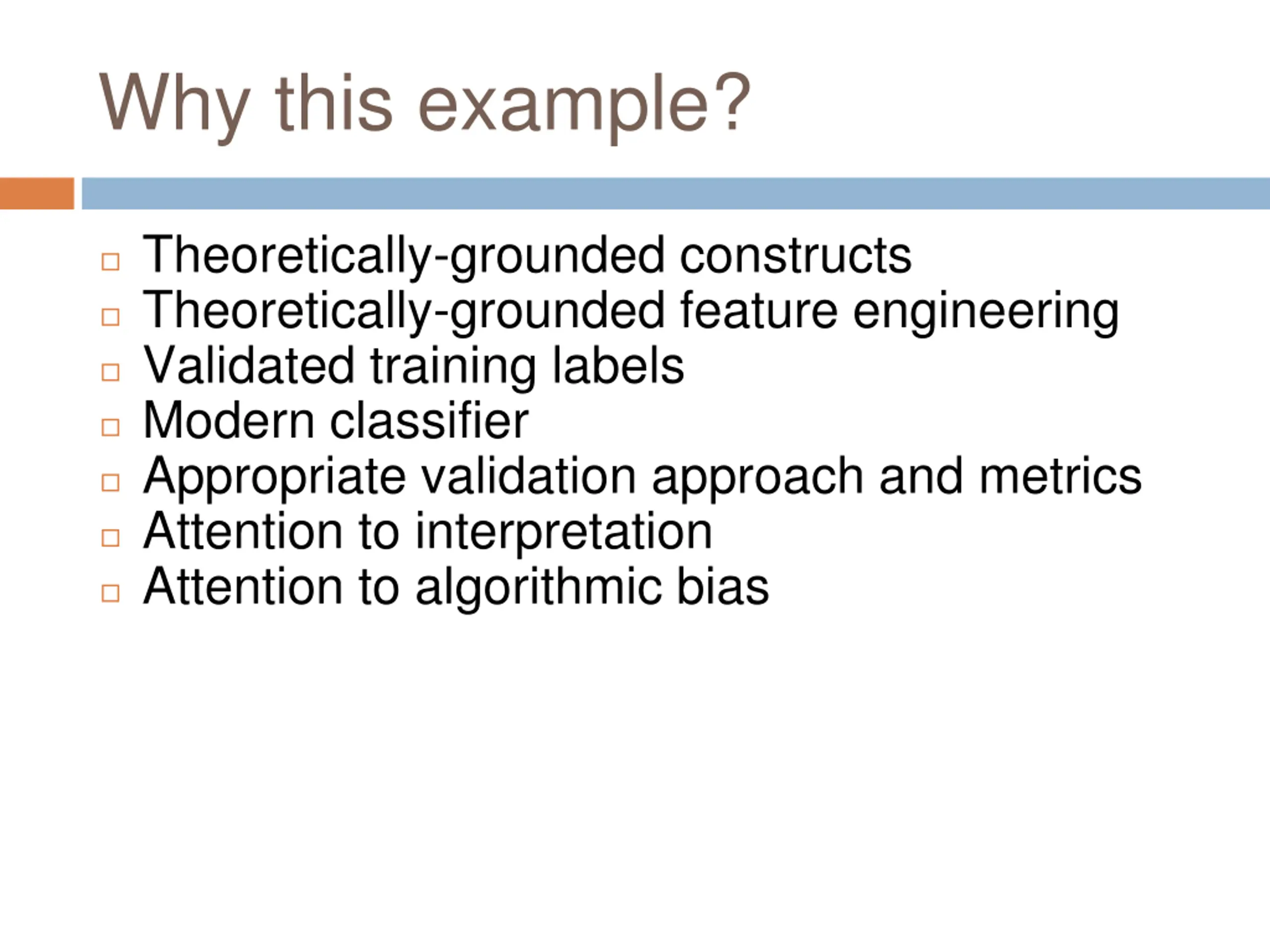 Why this example? Theoretically-grounded constructs Theoretically-grounded feature engineering Validated training labels Modern classifier Appropriate validation approach and metrics Attention to interpretation Attention to algorithmic bias