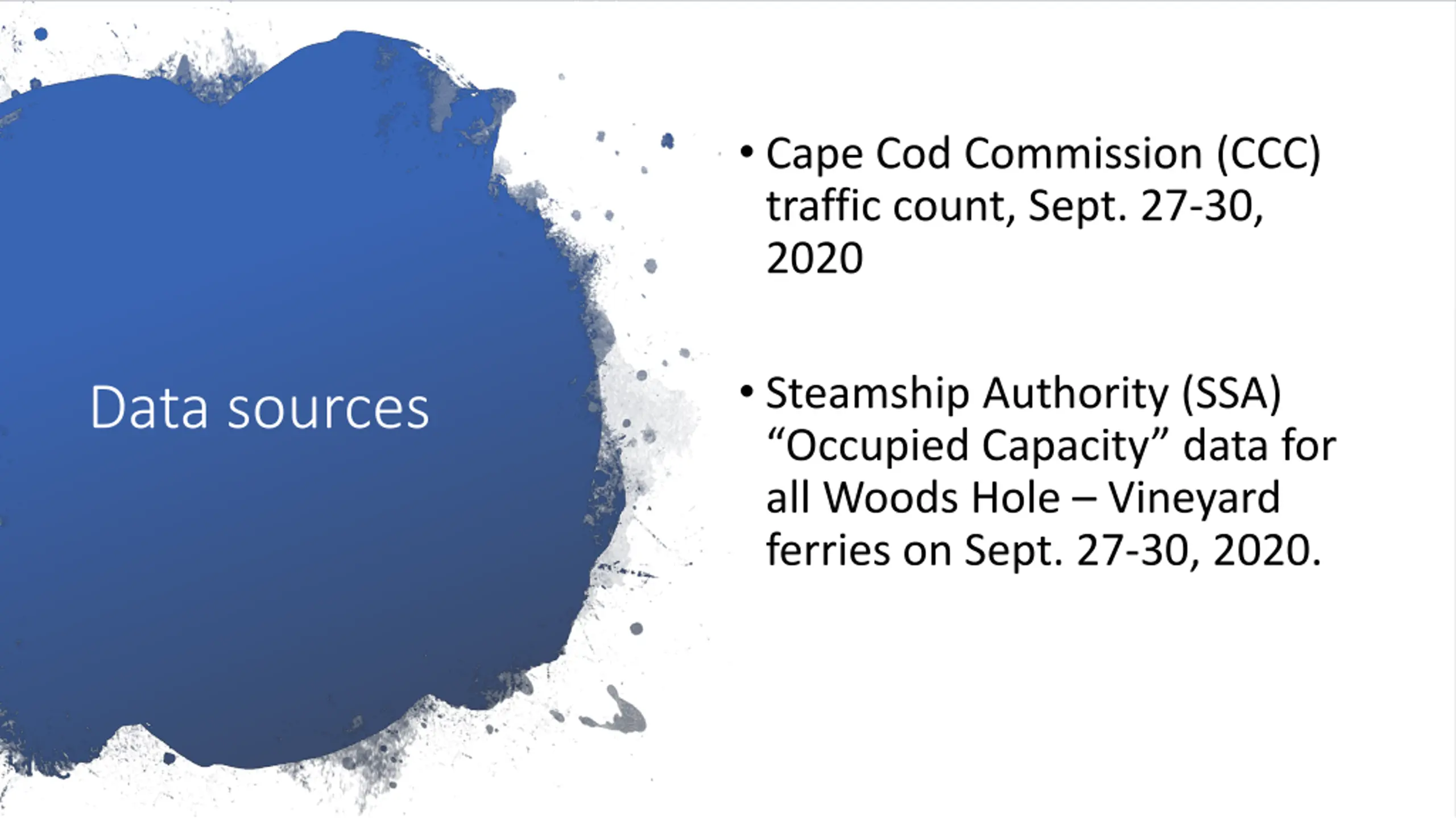 Cape Cod Commission (CCC) traffic count, Sept. 27-30, 2020 Steamship Authority (SSA) Occupied Capacity data for all Woods Hole Vineyard ferries on Sept. 27-30, 2020. Data sources