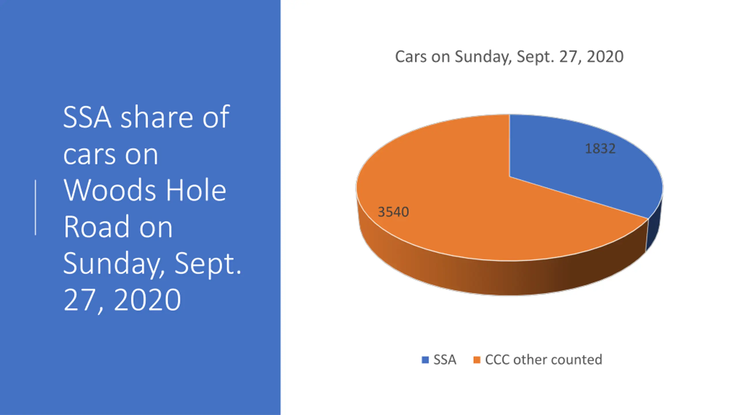 Cars on Sunday, Sept. 27, 2020 SSA share of cars on Woods Hole Road on Sunday, Sept. 27, 2020 1832 3540 SSA CCC other counted