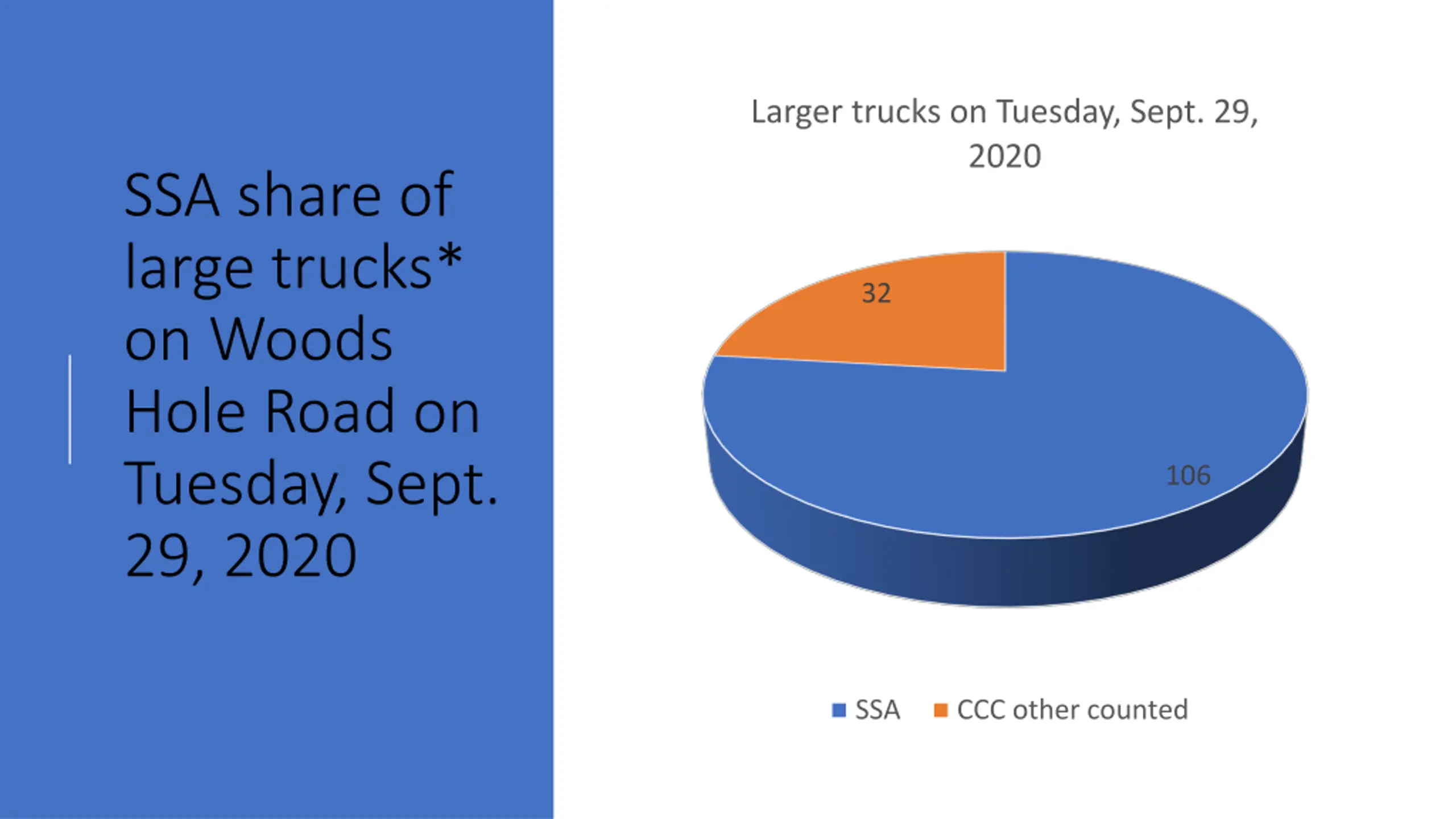 Larger trucks on Tuesday, Sept. 29, 2020 SSA share of large trucks* on Woods Hole Road on Tuesday, Sept. 29, 2020 32 106 SSA CCC other counted
