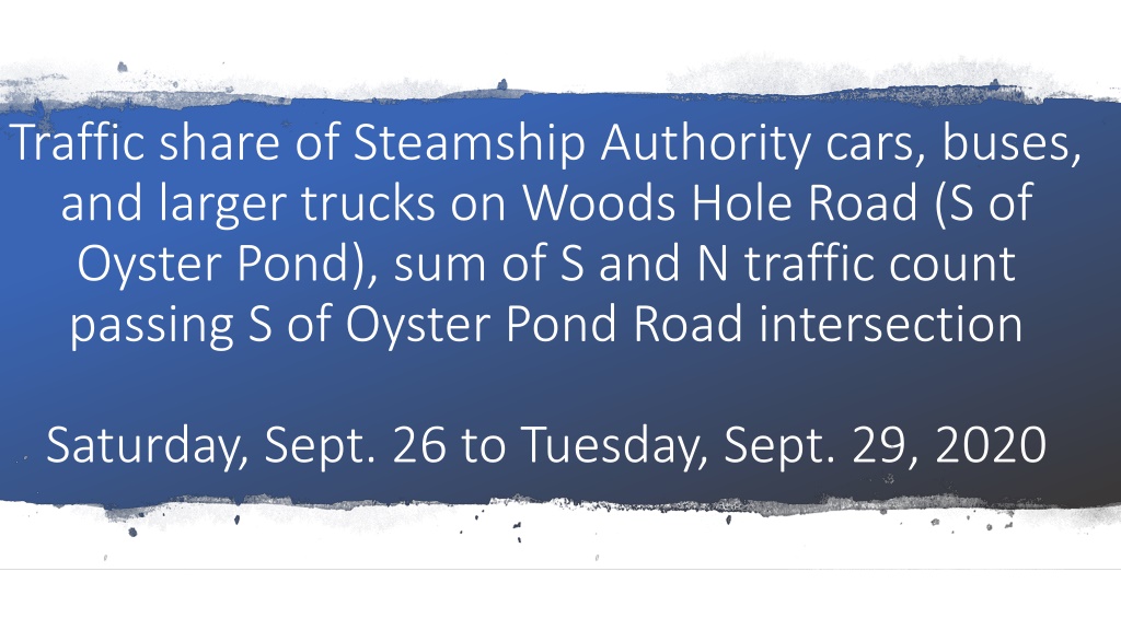 Analysis of traffic share data for Steamship Authority cars, buses, and larger trucks on Woods Hole Road during September 26-29, 2020. Includes traffic counts, occupied capacity data, and comparison with Cape Cod Commission data.
