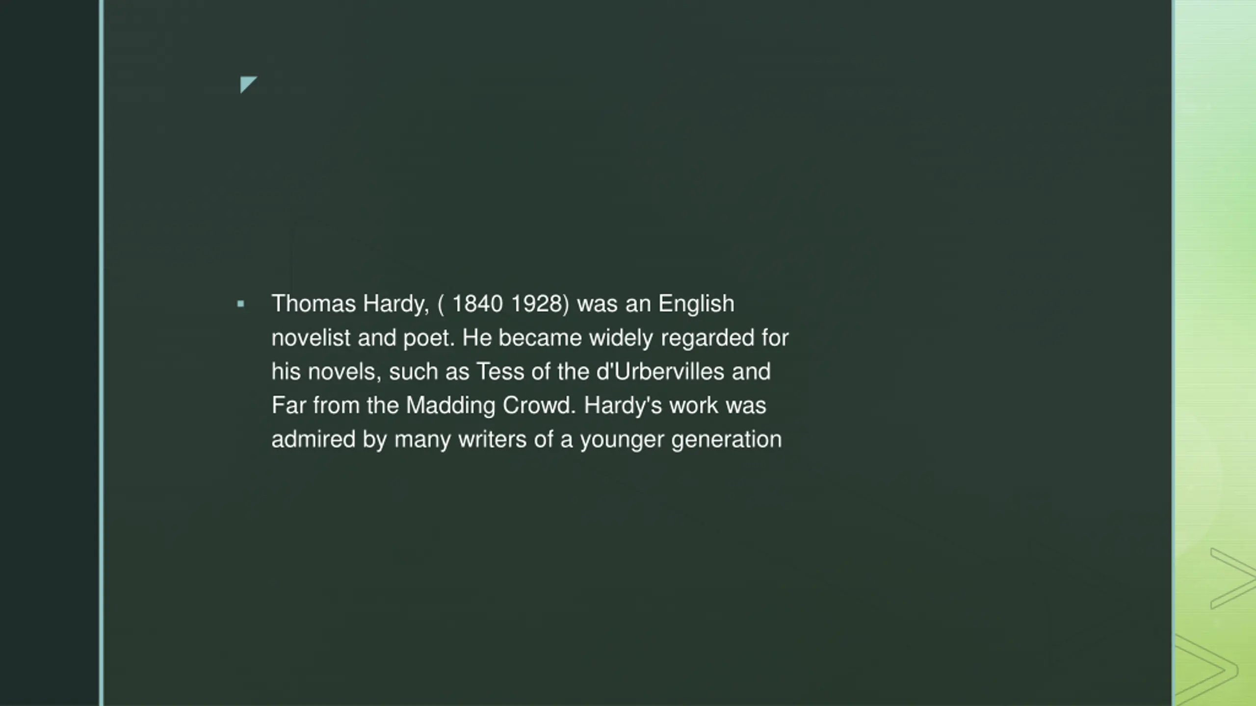 Thomas Hardy, ( 1840 1928) was an English novelist and poet. He became widely regarded for his novels, such as Tess of the d'Urbervilles and Far from the Madding Crowd. Hardy's work was admired by many writers of a younger generation