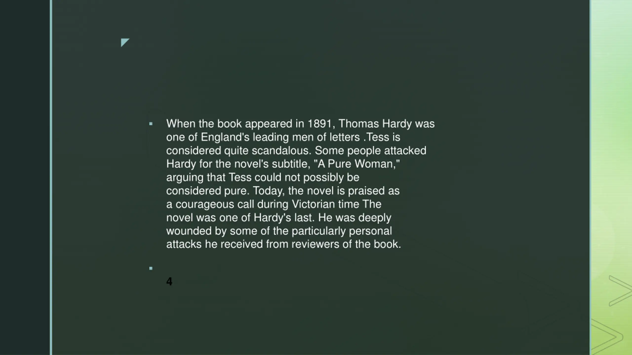 When the book appeared in 1891, Thomas Hardy was one of England's leading men of letters .Tess is considered quite scandalous. Some people attacked Hardy for the novel's subtitle, "A Pure Woman," arguing that Tess could not possibly be considered pure. Today, the novel is praised as a courageous call during Victorian time The novel was one of Hardy's last. He was deeply wounded by some of the particularly personal attacks he received from reviewers of the book. 4