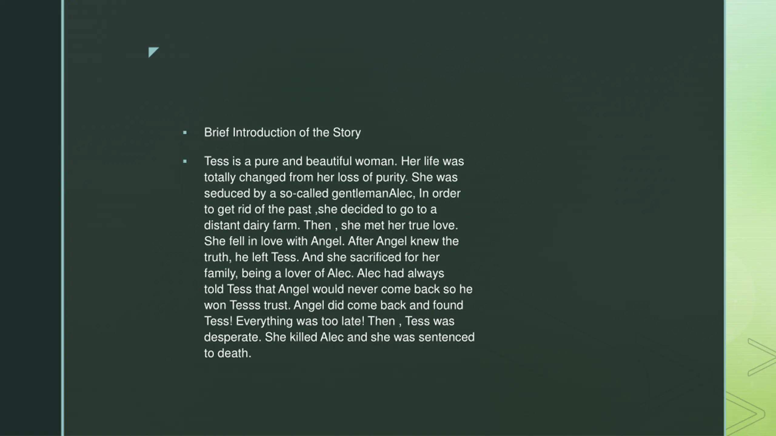 Brief Introduction of the Story Tess is a pure and beautiful woman. Her life was totally changed from her loss of purity. She was seduced by a so-called gentlemanAlec, In order to get rid of the past ,she decided to go to a distant dairy farm. Then , she met her true love. She fell in love with Angel. After Angel knew the truth, he left Tess. And she sacrificed for her family, being a lover of Alec. Alec had always told Tess that Angel would never come back so he won Tesss trust. Angel did come back and found Tess! Everything was too late! Then , Tess was desperate. She killed Alec and she was sentenced to death.