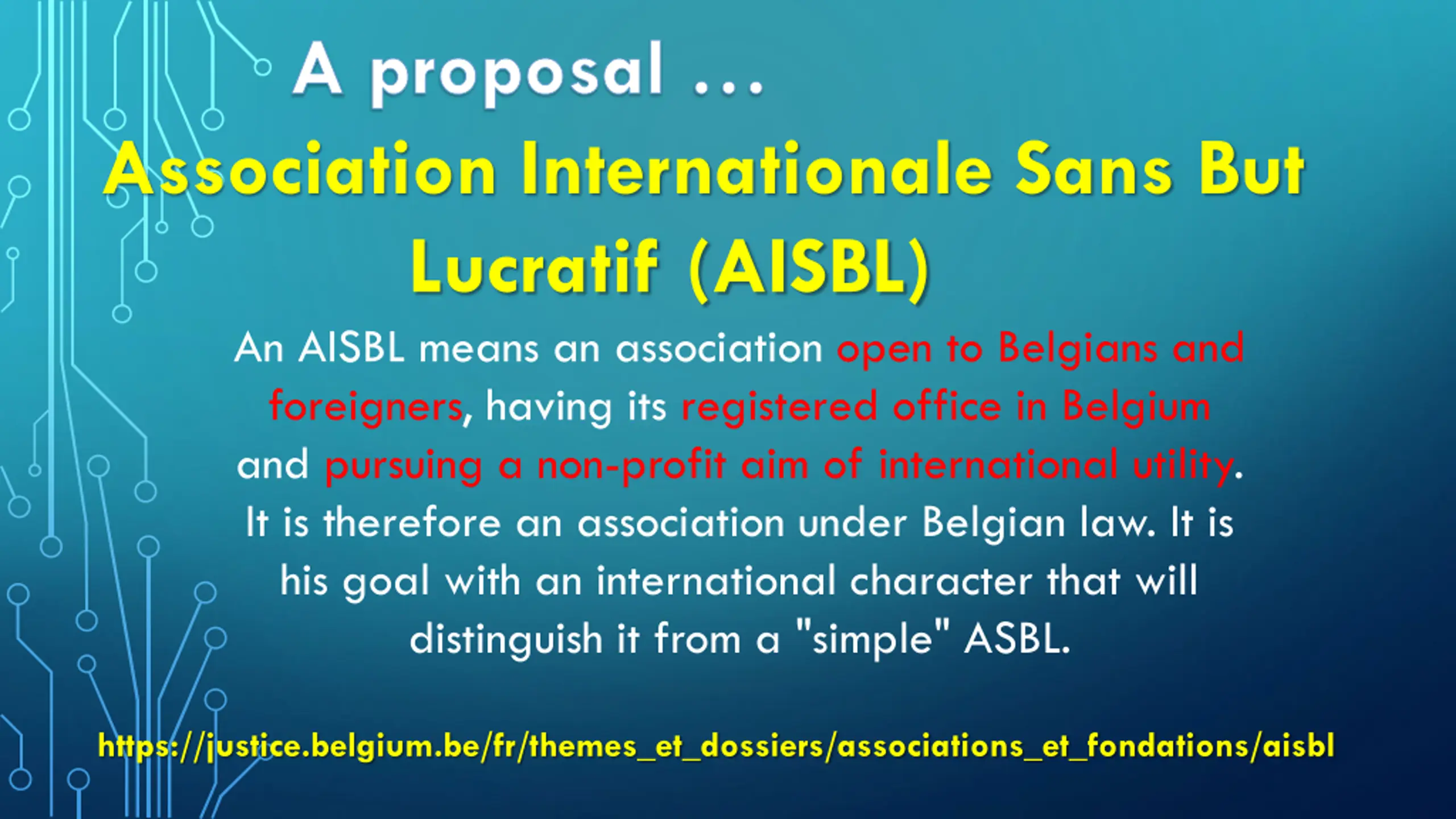 A proposal Association Internationale Sans But Lucratif (AISBL) An AISBL means an association open to Belgians and foreigners, having its registered office in Belgium and pursuing a non-profit aim of international utility. It is therefore an association under Belgian law. It is his goal with an international character that will distinguish it from a "simple" ASBL. https://justice.belgium.be/fr/themes_et_dossiers/associations_et_fondations/aisbl