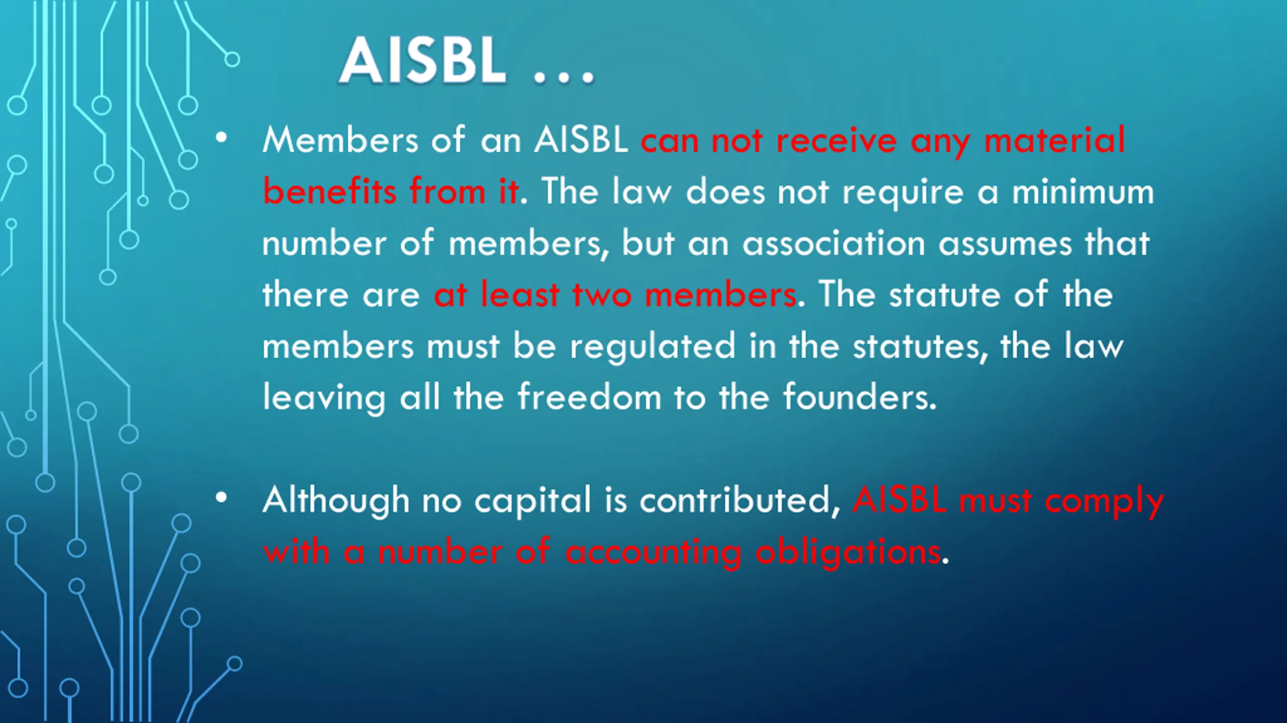 AISBL Members of an AISBL can not receive any material benefits from it. The law does not require a minimum number of members, but an association assumes that there are at least two members. The statute of the members must be regulated in the statutes, the law leaving all the freedom to the founders. Although no capital is contributed, AISBL must comply with a number of accounting obligations.