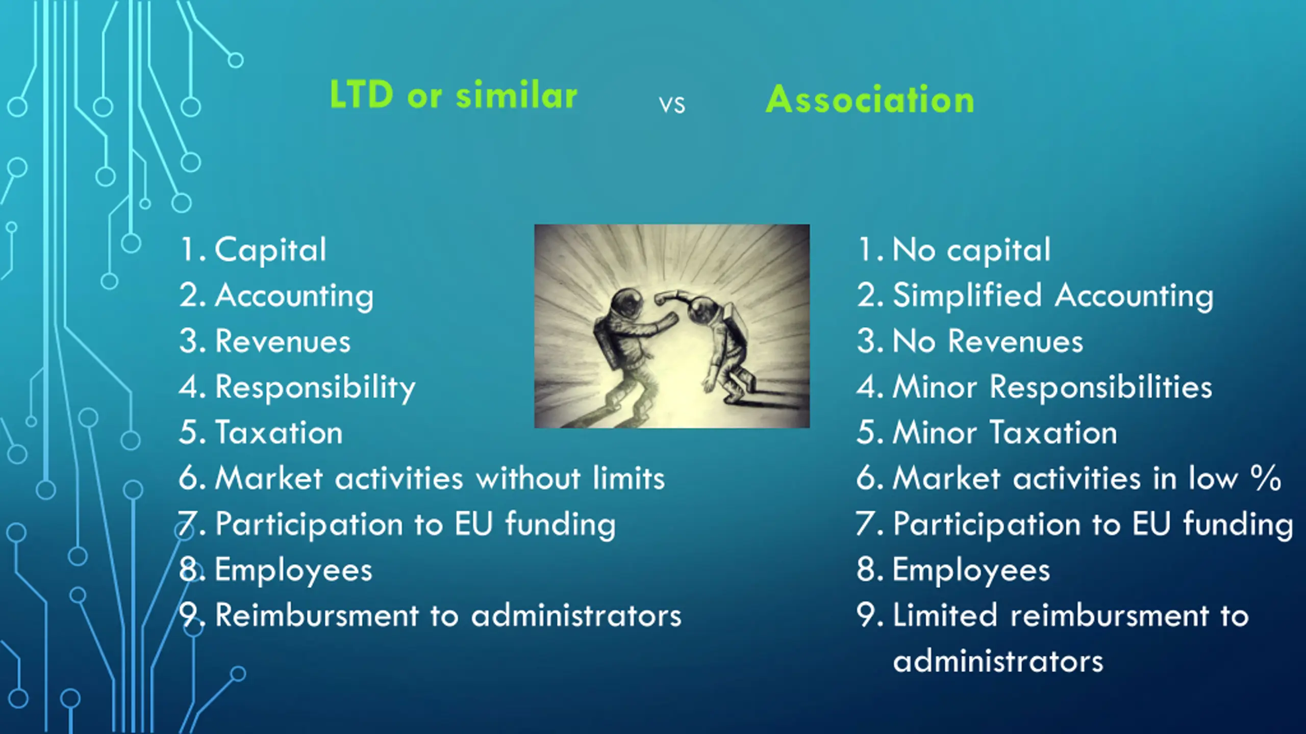 LTD or similar Association VS 1.Capital 2.Accounting 3.Revenues 4.Responsibility 5.Taxation 6.Market activities without limits 7.Participation to EU funding 8.Employees 9.Reimbursment to administrators 1.No capital 2.Simplified Accounting 3.No Revenues 4.Minor Responsibilities 5.Minor Taxation 6.Market activities in low % 7.Participation to EU funding 8.Employees 9.Limited reimbursment to administrators
