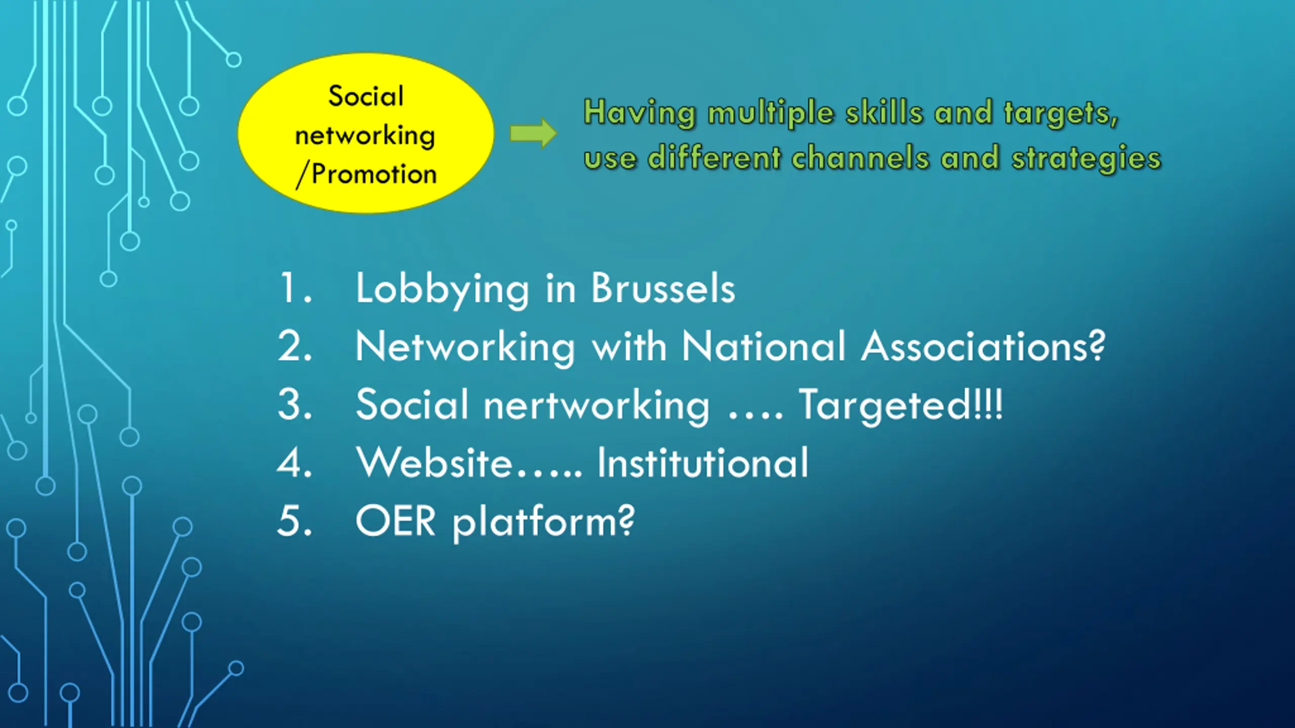 Social networking /Promotion Having multiple skills and targets, use different channels and strategies 1. Lobbying in Brussels 2. Networking with National Associations? 3. Social nertworking . Targeted!!! 4. Website .. Institutional 5. OER platform?