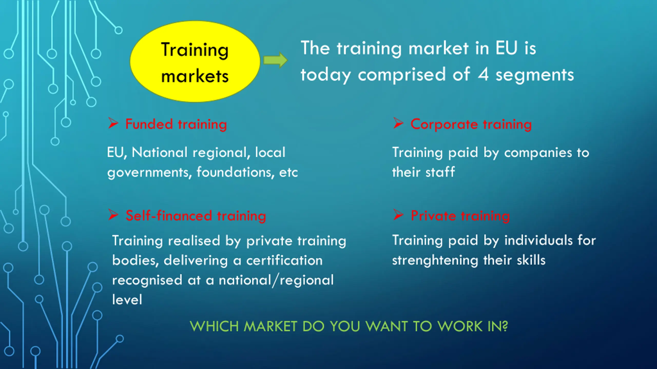 The training market in EU is today comprised of 4 segments Training markets Funded training Corporate training EU, National regional, local governments, foundations, etc Training paid by companies to their staff Self-financed training Training realised by private training bodies, delivering a certification recognised at a national/regional level Private training Training paid by individuals for strenghtening their skills WHICH MARKET DO YOU WANT TO WORK IN?