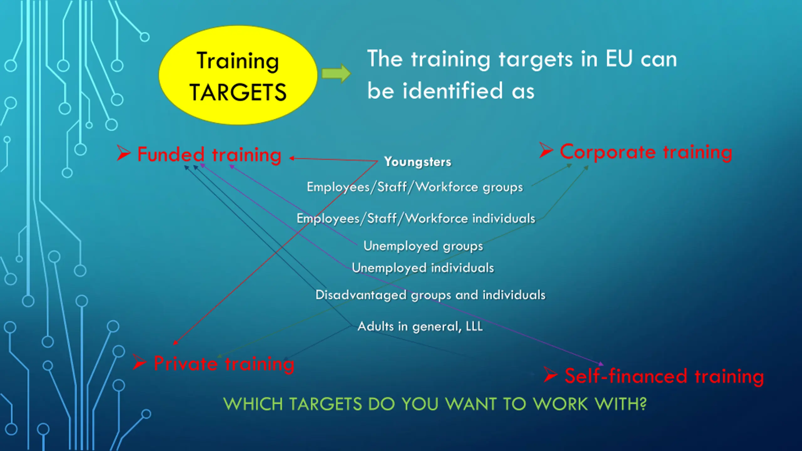 The training targets in EU can be identified as Training TARGETS Corporate training Funded training Youngsters Employees/Staff/Workforce groups Employees/Staff/Workforce individuals Unemployed groups Unemployed individuals Disadvantaged groups and individuals Adults in general, LLL Private training Self-financed training WHICH TARGETS DO YOU WANT TO WORK WITH?