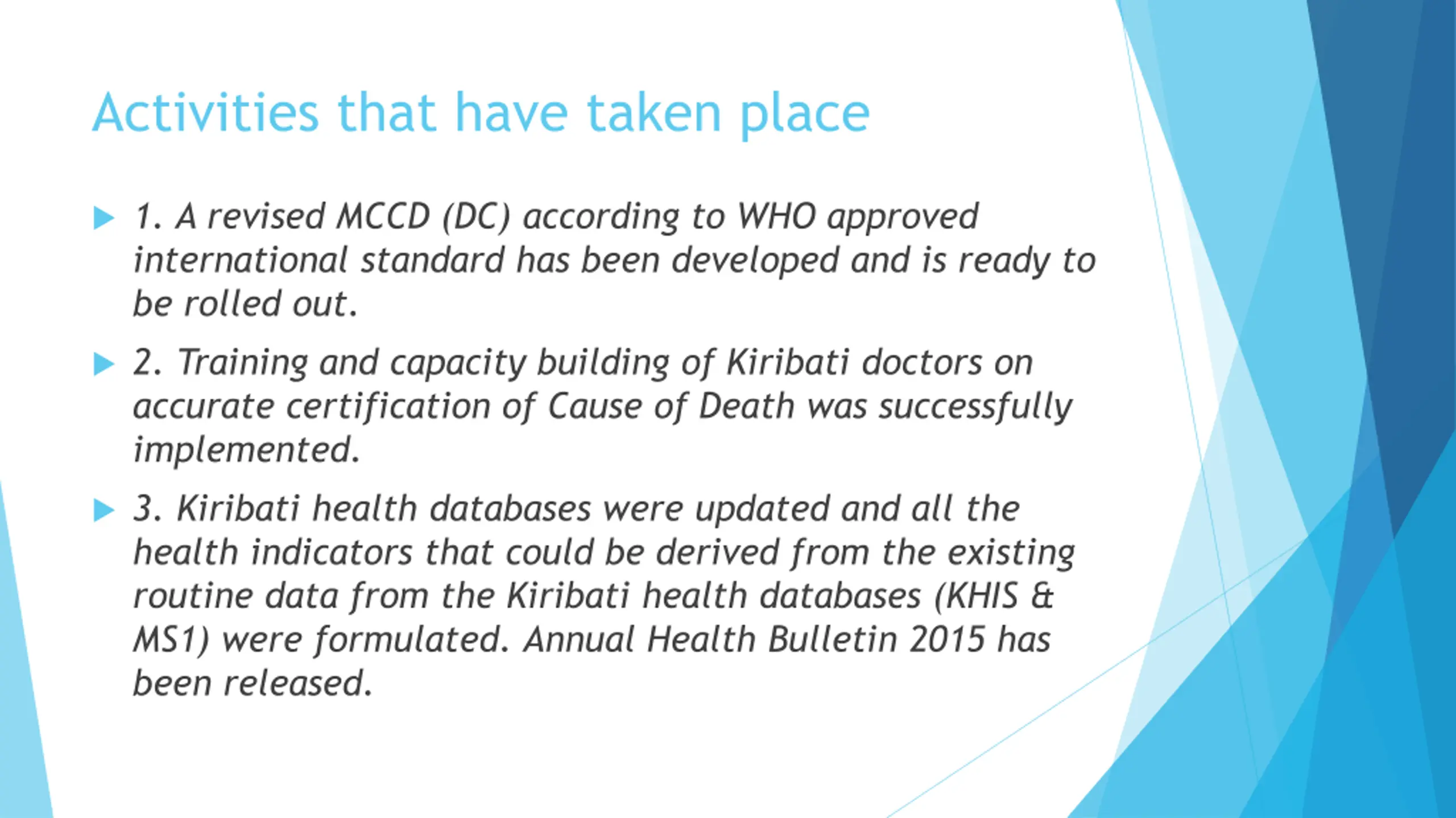 Activities that have taken place 1. A revised MCCD (DC) according to WHO approved international standard has been developed and is ready to be rolled out. 2. Training and capacity building of Kiribati doctors on accurate certification of Cause of Death was successfully implemented. 3. Kiribati health databases were updated and all the health indicators that could be derived from the existing routine data from the Kiribati health databases (KHIS & MS1) were formulated. Annual Health Bulletin 2015 has been released.