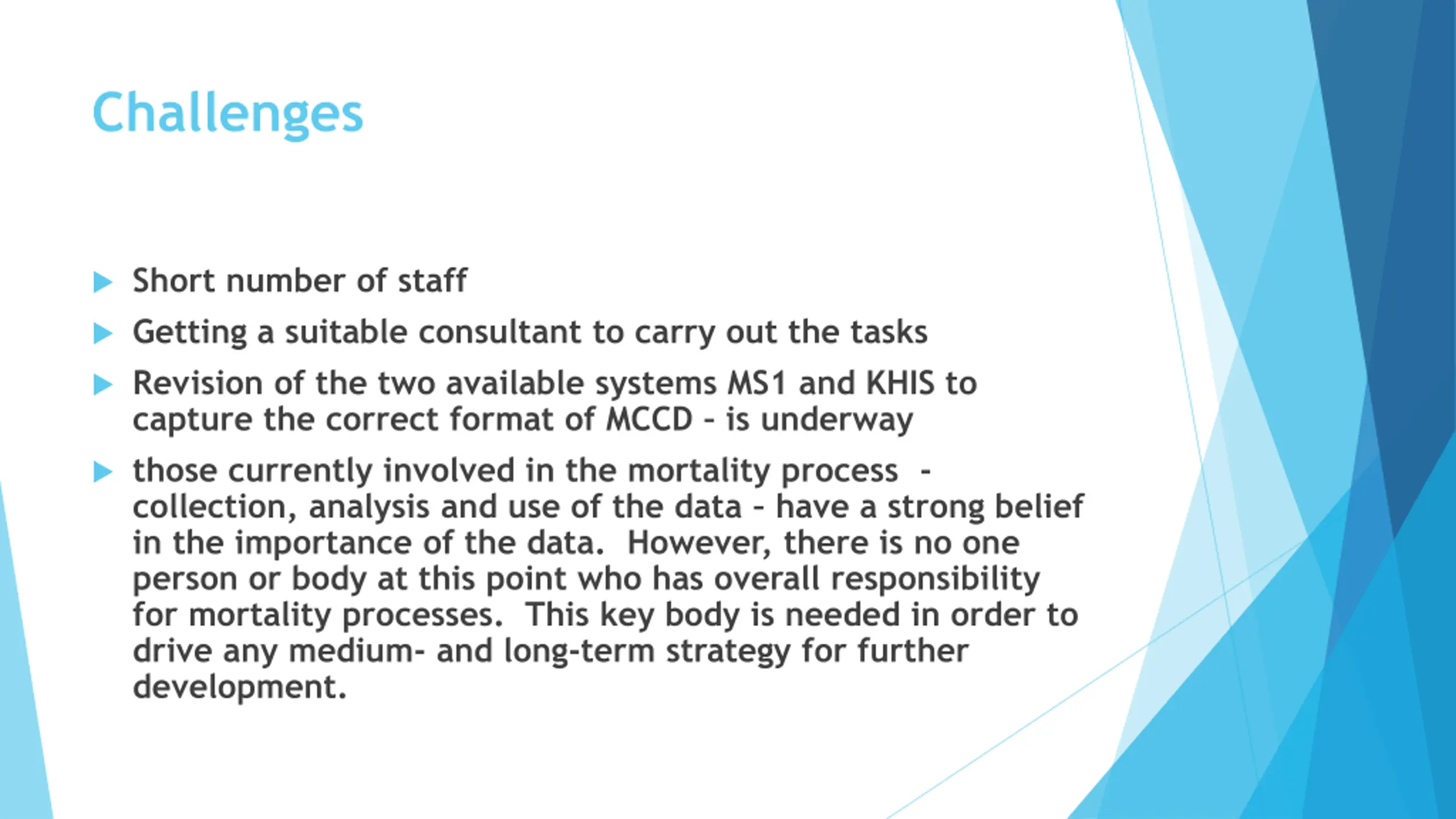 Challenges Short number of staff Getting a suitable consultant to carry out the tasks Revision of the two available systems MS1 and KHIS to capture the correct format of MCCD is underway those currently involved in the mortality process - collection, analysis and use of the data have a strong belief in the importance of the data. However, there is no one person or body at this point who has overall responsibility for mortality processes. This key body is needed in order to drive any medium- and long-term strategy for further development.