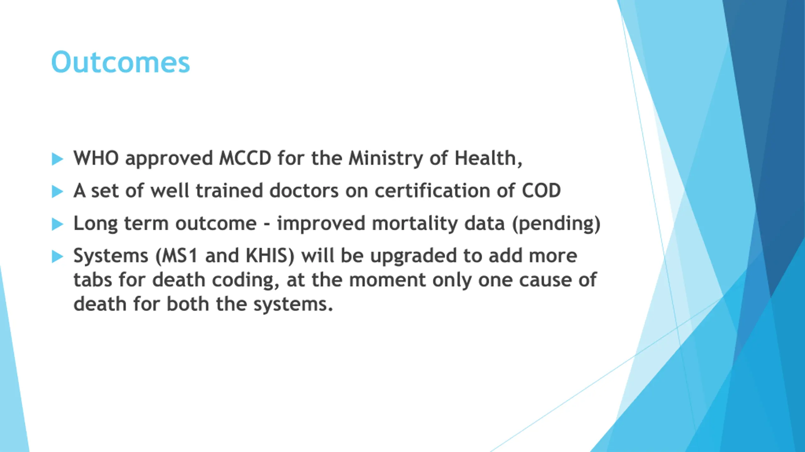 Outcomes WHO approved MCCD for the Ministry of Health, A set of well trained doctors on certification of COD Long term outcome - improved mortality data (pending) Systems (MS1 and KHIS) will be upgraded to add more tabs for death coding, at the moment only one cause of death for both the systems.