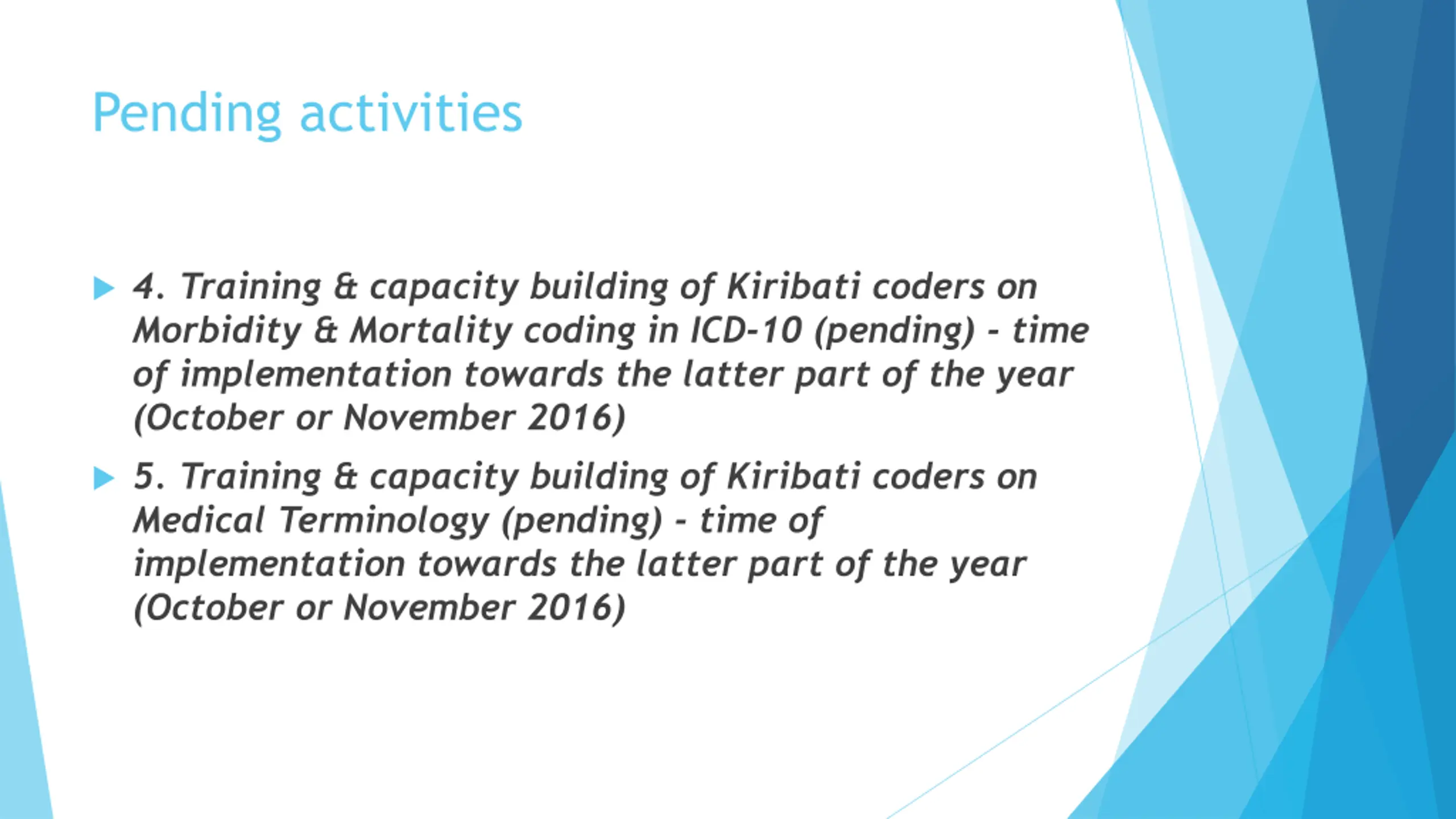 Pending activities 4. Training & capacity building of Kiribati coders on Morbidity & Mortality coding in ICD-10 (pending) - time of implementation towards the latter part of the year (October or November 2016) 5. Training & capacity building of Kiribati coders on Medical Terminology (pending) - time of implementation towards the latter part of the year (October or November 2016)