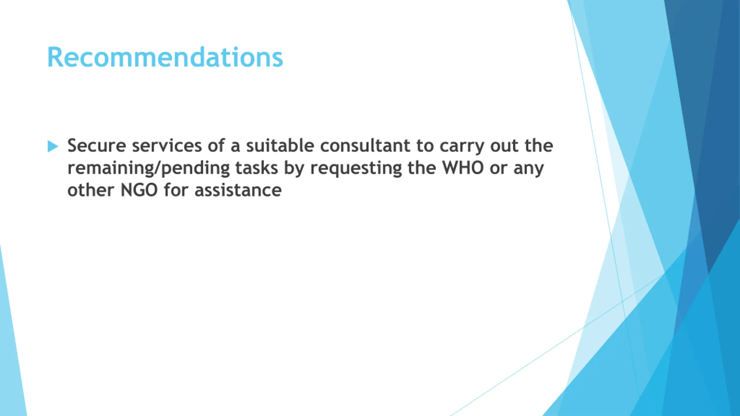 Recommendations Secure services of a suitable consultant to carry out the remaining/pending tasks by requesting the WHO or any other NGO for assistance