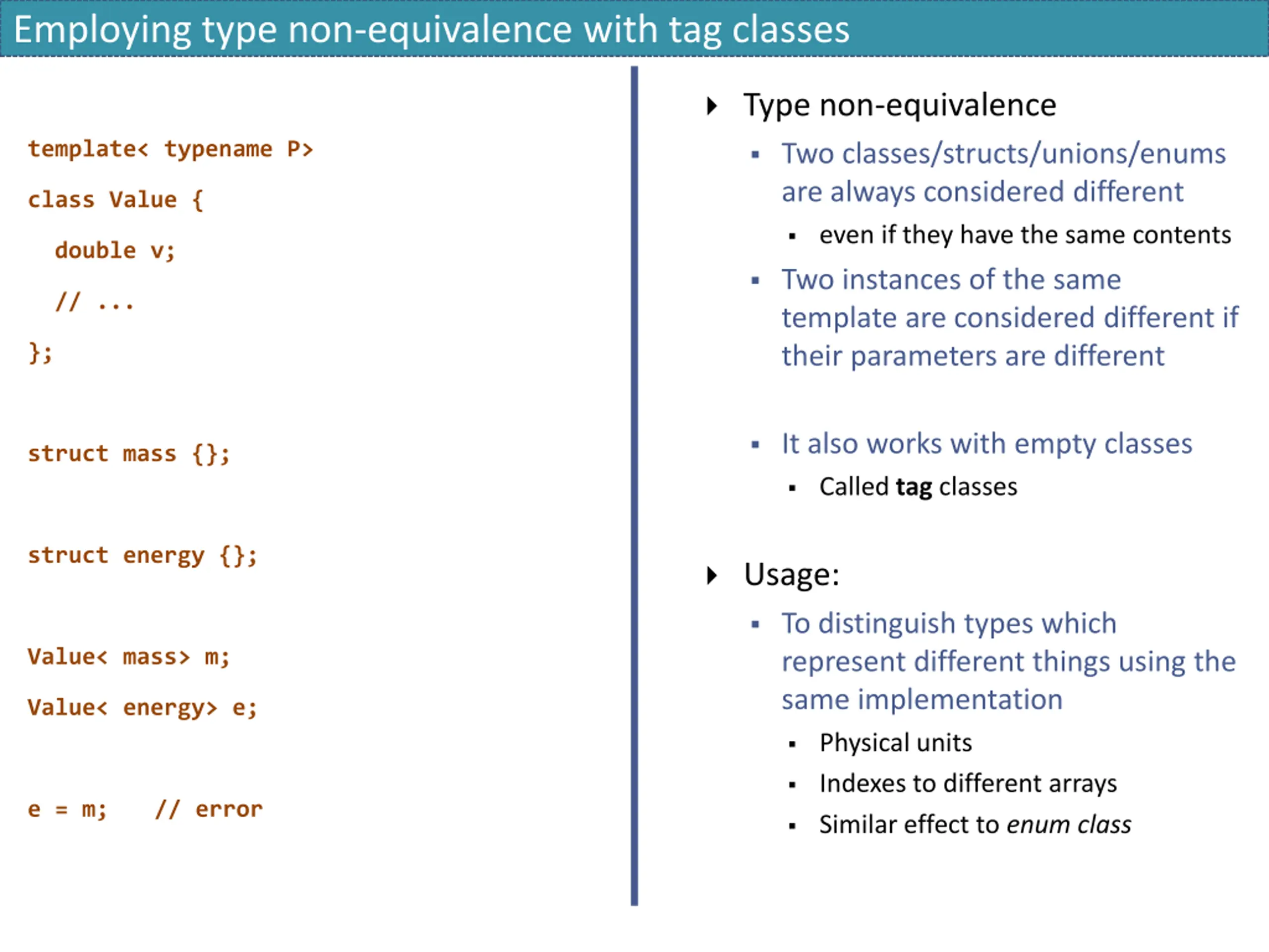 Employing type non-equivalence with tag classes Type non-equivalence template< typename P> Two classes/structs/unions/enums are always considered different class Value { even if they have the same contents double v; Two instances of the same template are considered different if their parameters are different // ... }; It also works with empty classes struct mass {}; Called tag classes struct energy {}; Usage: To distinguish types which represent different things using the same implementation Value< mass> m; Value< energy> e; Physical units Indexes to different arrays e = m; // error Similar effect to enum class