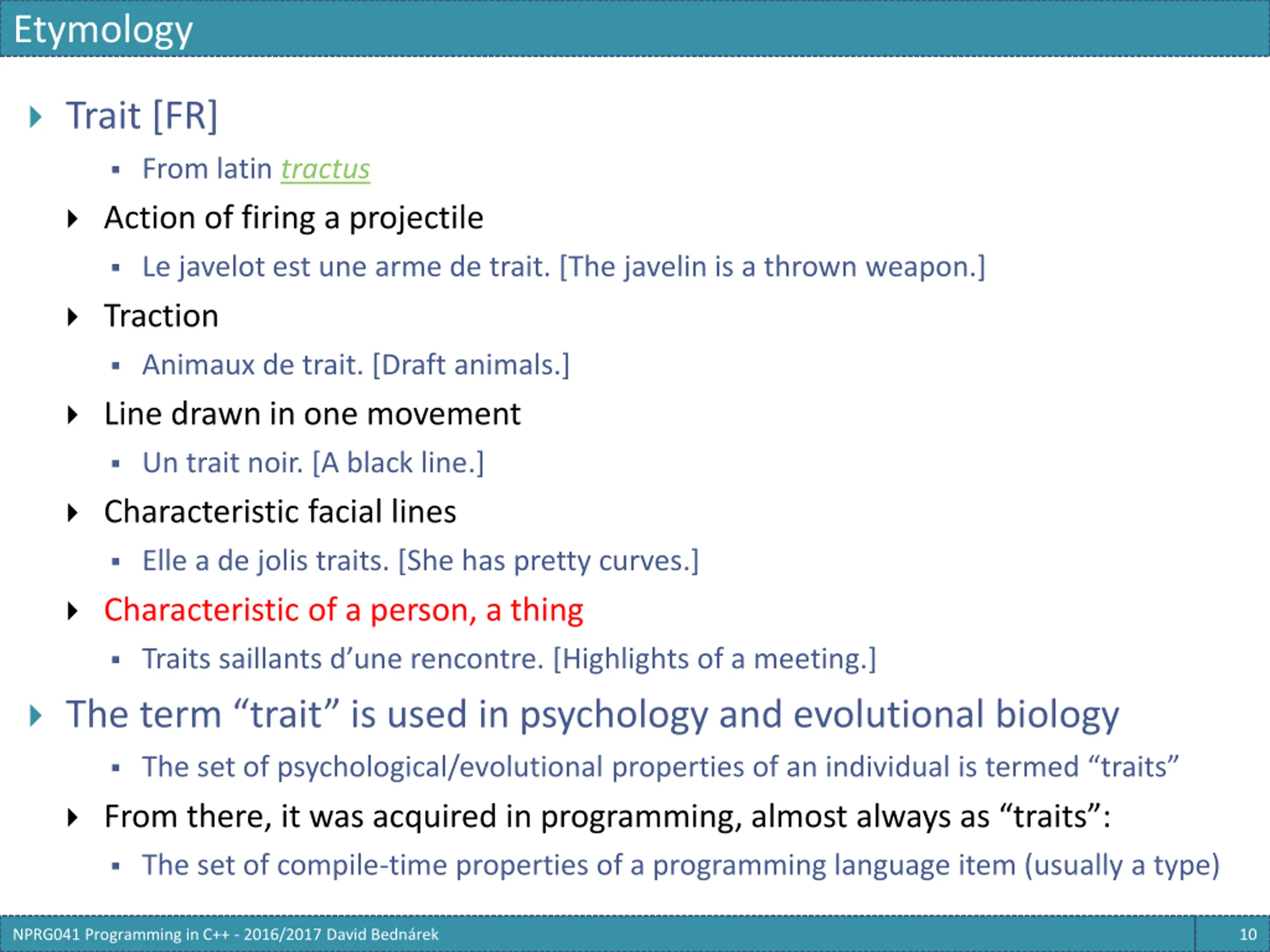 Etymology Trait [FR] From latin tractus Action of firing a projectile Le javelot est une arme de trait. [The javelin is a thrown weapon.] Traction Animaux de trait. [Draft animals.] Line drawn in one movement Un trait noir. [A black line.] Characteristic facial lines Elle a de jolis traits. [She has pretty curves.] Characteristic of a person, a thing Traits saillants d une rencontre. [Highlights of a meeting.] The term trait is used in psychology and evolutional biology The set of psychological/evolutional properties of an individual is termed traits From there, it was acquired in programming, almost always as traits : The set of compile-time properties of a programming language item (usually a type) NPRG041 Programming in C++ - 2016/2017 David Bedn rek 10