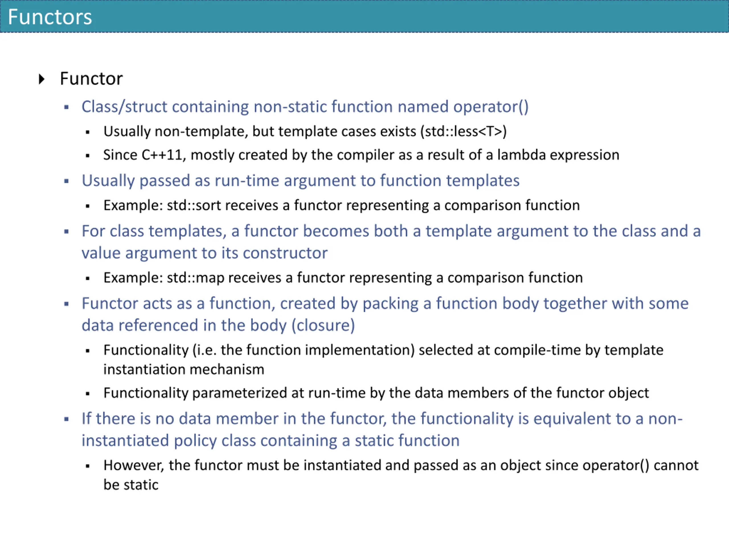 Functors Functor Class/struct containing non-static function named operator() Usually non-template, but template cases exists (std::less<T>) Since C++11, mostly created by the compiler as a result of a lambda expression Usually passed as run-time argument to function templates Example: std::sort receives a functor representing a comparison function For class templates, a functor becomes both a template argument to the class and a value argument to its constructor Example: std::map receives a functor representing a comparison function Functor acts as a function, created by packing a function body together with some data referenced in the body (closure) Functionality (i.e. the function implementation) selected at compile-time by template instantiation mechanism Functionality parameterized at run-time by the data members of the functor object If there is no data member in the functor, the functionality is equivalent to a non- instantiated policy class containing a static function However, the functor must be instantiated and passed as an object since operator() cannot be static