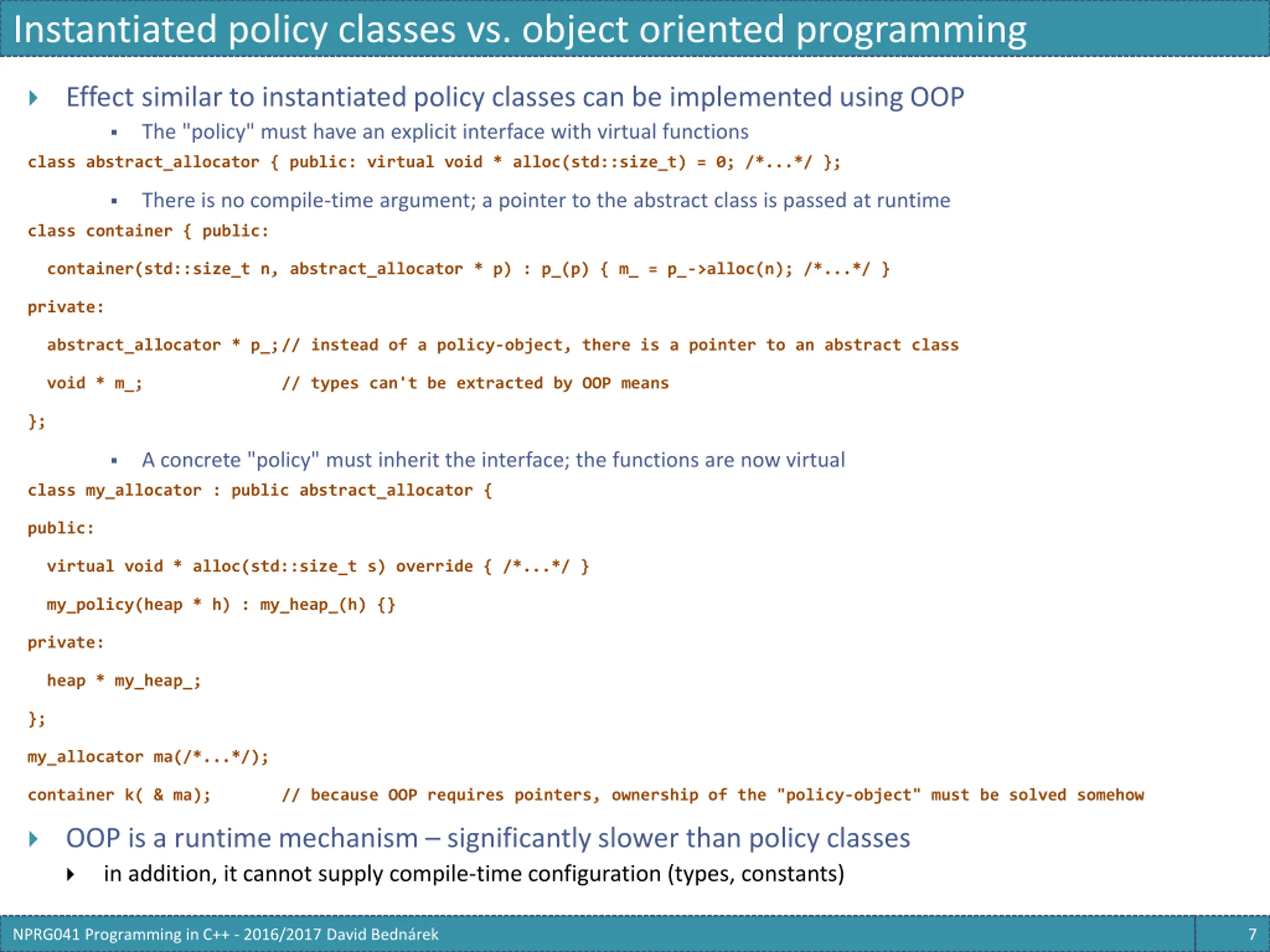 Instantiated policy classes vs. object oriented programming Effect similar to instantiated policy classes can be implemented using OOP The "policy" must have an explicit interface with virtual functions class abstract_allocator { public: virtual void * alloc(std::size_t) = 0; /*...*/ }; There is no compile-time argument; a pointer to the abstract class is passed at runtime class container { public: container(std::size_t n, abstract_allocator * p) : p_(p) { m_ = p_->alloc(n); /*...*/ } private: abstract_allocator * p_;// instead of a policy-object, there is a pointer to an abstract class void * m_; // types can't be extracted by OOP means }; A concrete "policy" must inherit the interface; the functions are now virtual class my_allocator : public abstract_allocator { public: virtual void * alloc(std::size_t s) override { /*...*/ } my_policy(heap * h) : my_heap_(h) {} private: heap * my_heap_; }; my_allocator ma(/*...*/); container k( & ma); // because OOP requires pointers, ownership of the "policy-object" must be solved somehow OOP is a runtime mechanism significantly slower than policy classes in addition, it cannot supply compile-time configuration (types, constants) NPRG041 Programming in C++ - 2016/2017 David Bedn rek 7