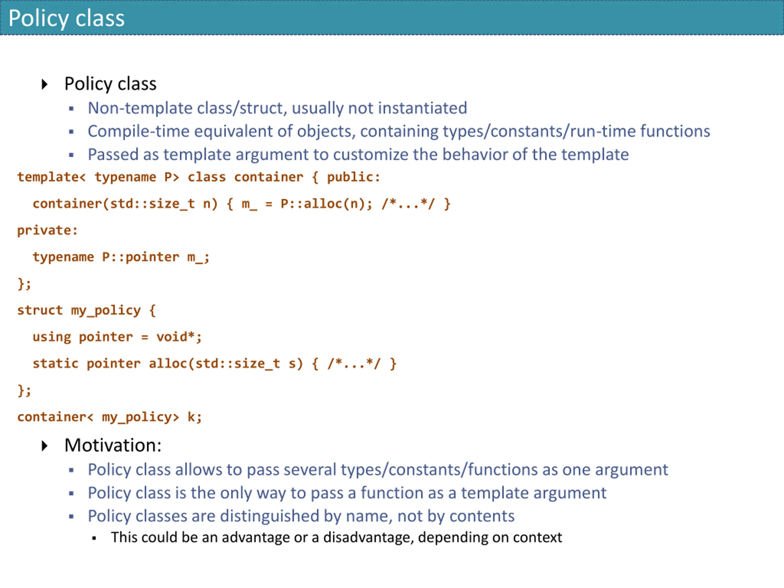 Policy class Policy class Non-template class/struct, usually not instantiated Compile-time equivalent of objects, containing types/constants/run-time functions Passed as template argument to customize the behavior of the template template< typename P> class container { public: container(std::size_t n) { m_ = P::alloc(n); /*...*/ } private: typename P::pointer m_; }; struct my_policy { using pointer = void*; static pointer alloc(std::size_t s) { /*...*/ } }; container< my_policy> k; Motivation: Policy class allows to pass several types/constants/functions as one argument Policy class is the only way to pass a function as a template argument Policy classes are distinguished by name, not by contents This could be an advantage or a disadvantage, depending on context