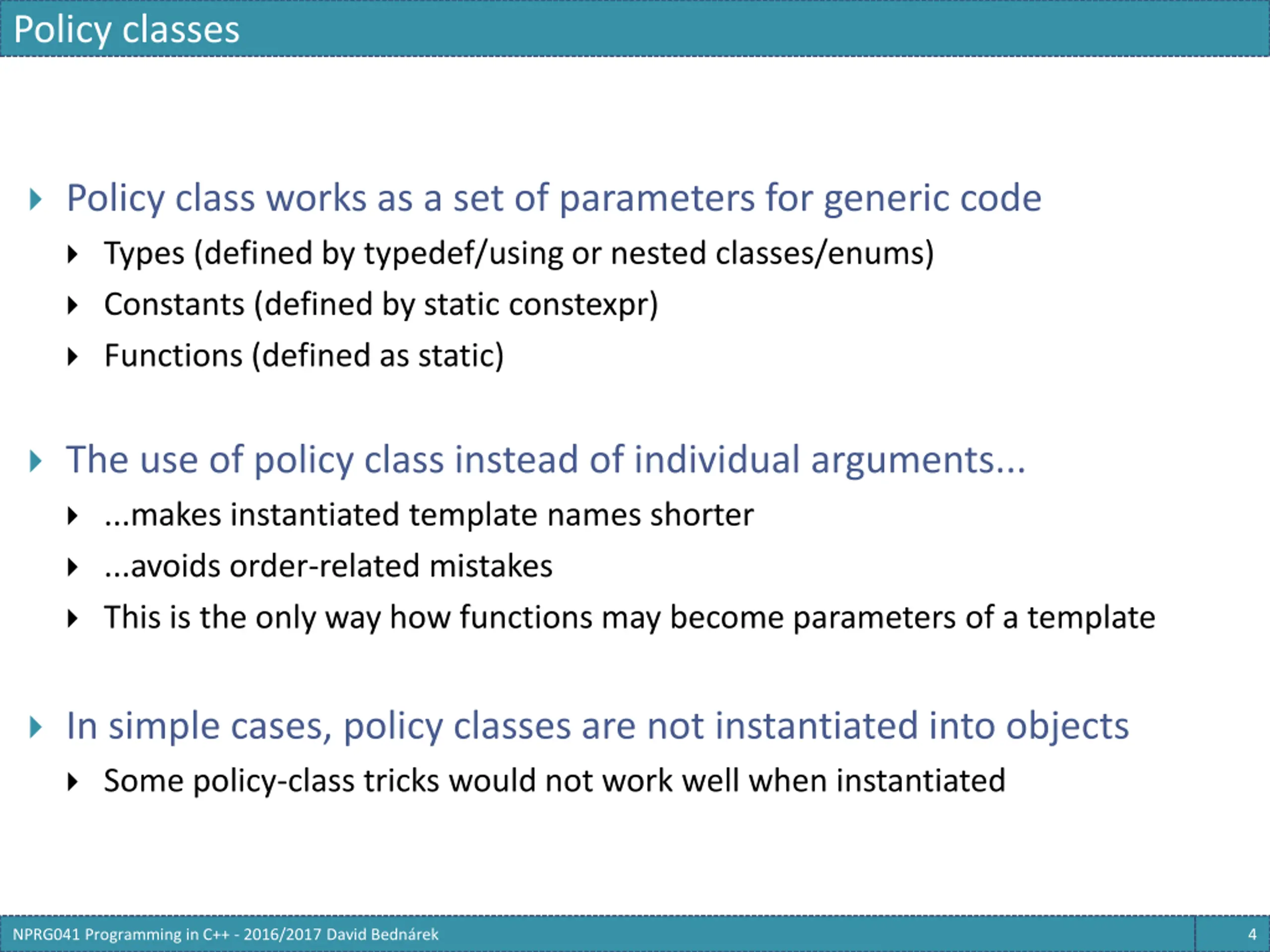 Policy classes Policy class works as a set of parameters for generic code Types (defined by typedef/using or nested classes/enums) Constants (defined by static constexpr) Functions (defined as static) The use of policy class instead of individual arguments... ...makes instantiated template names shorter ...avoids order-related mistakes This is the only way how functions may become parameters of a template In simple cases, policy classes are not instantiated into objects Some policy-class tricks would not work well when instantiated NPRG041 Programming in C++ - 2016/2017 David Bedn rek 4