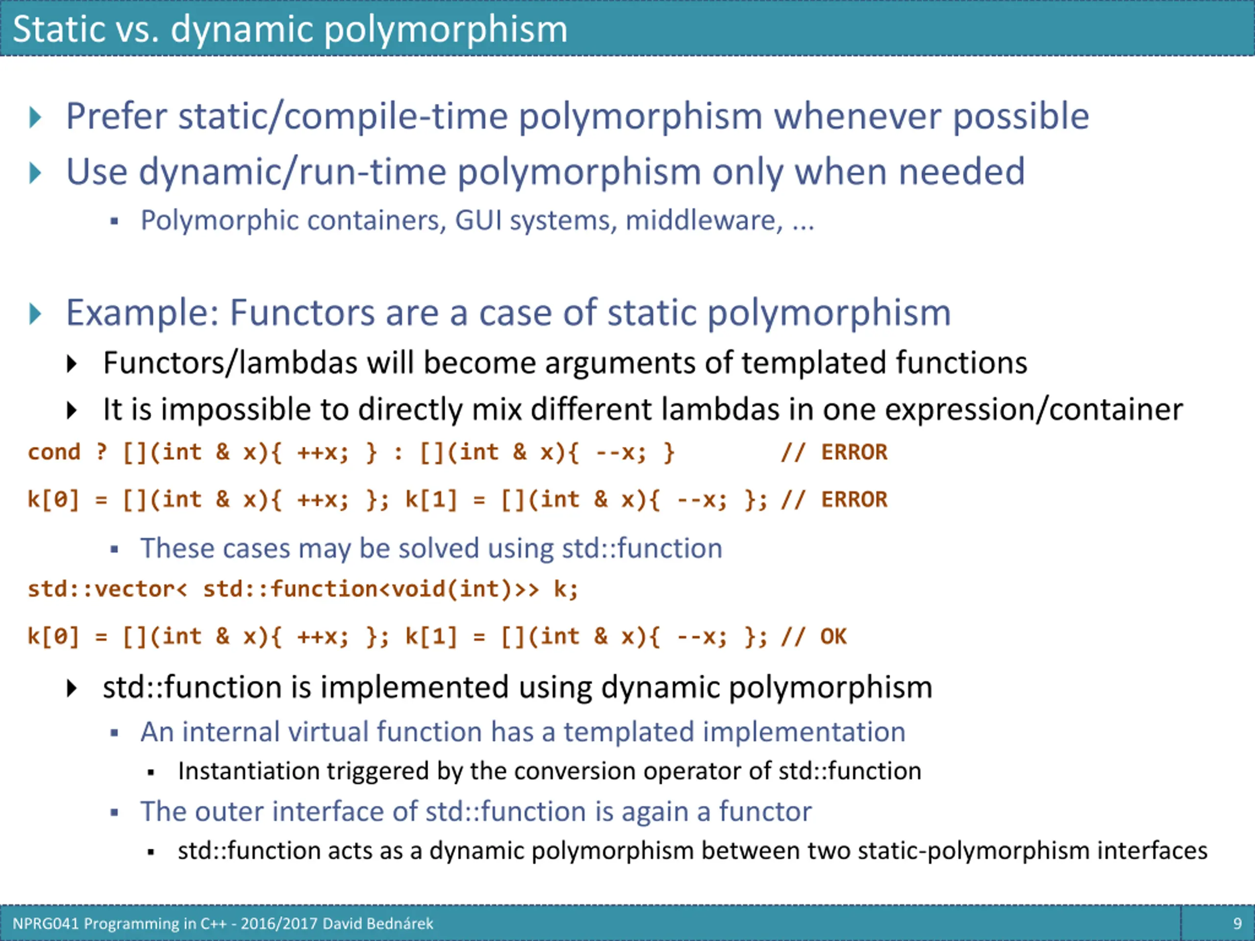 Static vs. dynamic polymorphism Prefer static/compile-time polymorphism whenever possible Use dynamic/run-time polymorphism only when needed Polymorphic containers, GUI systems, middleware, ... Example: Functors are a case of static polymorphism Functors/lambdas will become arguments of templated functions It is impossible to directly mix different lambdas in one expression/container cond ? [](int & x){ ++x; } : [](int & x){ --x; } // ERROR k[0] = [](int & x){ ++x; }; k[1] = [](int & x){ --x; }; // ERROR These cases may be solved using std::function std::vector< std::function<void(int)>> k; k[0] = [](int & x){ ++x; }; k[1] = [](int & x){ --x; }; // OK std::function is implemented using dynamic polymorphism An internal virtual function has a templated implementation Instantiation triggered by the conversion operator of std::function The outer interface of std::function is again a functor std::function acts as a dynamic polymorphism between two static-polymorphism interfaces NPRG041 Programming in C++ - 2016/2017 David Bedn rek 9