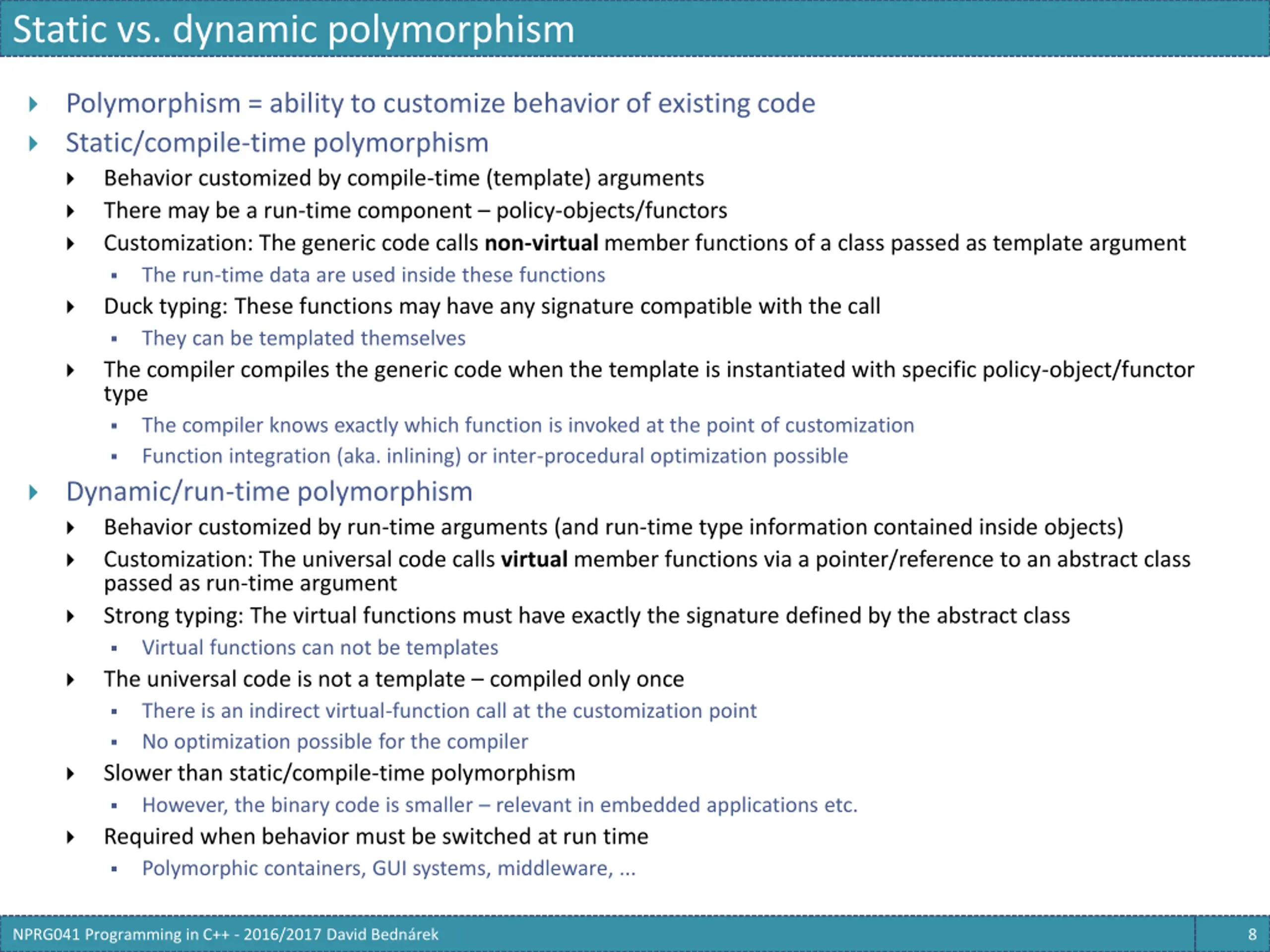 Static vs. dynamic polymorphism Polymorphism = ability to customize behavior of existing code Static/compile-time polymorphism Behavior customized by compile-time (template) arguments There may be a run-time component policy-objects/functors Customization: The generic code calls non-virtual member functions of a class passed as template argument The run-time data are used inside these functions Duck typing: These functions may have any signature compatible with the call They can be templated themselves The compiler compiles the generic code when the template is instantiated with specific policy-object/functor type The compiler knows exactly which function is invoked at the point of customization Function integration (aka. inlining) or inter-procedural optimization possible Dynamic/run-time polymorphism Behavior customized by run-time arguments (and run-time type information contained inside objects) Customization: The universal code calls virtual member functions via a pointer/reference to an abstract class passed as run-time argument Strong typing: The virtual functions must have exactly the signature defined by the abstract class Virtual functions can not be templates The universal code is not a template compiled only once There is an indirect virtual-function call at the customization point No optimization possible for the compiler Slower than static/compile-time polymorphism However, the binary code is smaller relevant in embedded applications etc. Required when behavior must be switched at run time Polymorphic containers, GUI systems, middleware, ... NPRG041 Programming in C++ - 2016/2017 David Bedn rek 8