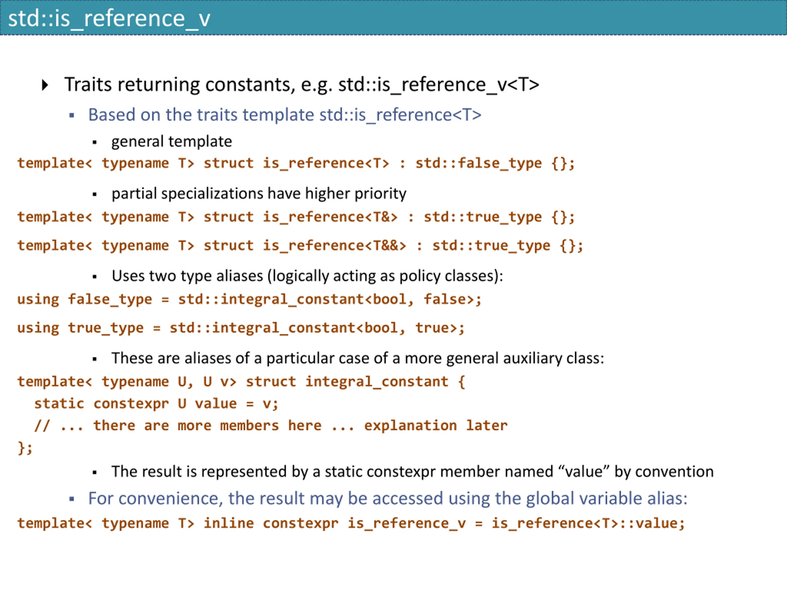 std::is_reference_v Traits returning constants, e.g. std::is_reference_v<T> Based on the traits template std::is_reference<T> general template template< typename T> struct is_reference<T> : std::false_type {}; partial specializations have higher priority template< typename T> struct is_reference<T&> : std::true_type {}; template< typename T> struct is_reference<T&&> : std::true_type {}; Uses two type aliases (logically acting as policy classes): using false_type = std::integral_constant<bool, false>; using true_type = std::integral_constant<bool, true>; These are aliases of a particular case of a more general auxiliary class: template< typename U, U v> struct integral_constant { static constexpr U value = v; // ... there are more members here ... explanation later }; The result is represented by a static constexpr member named value by convention For convenience, the result may be accessed using the global variable alias: template< typename T> inline constexpr is_reference_v = is_reference<T>::value;