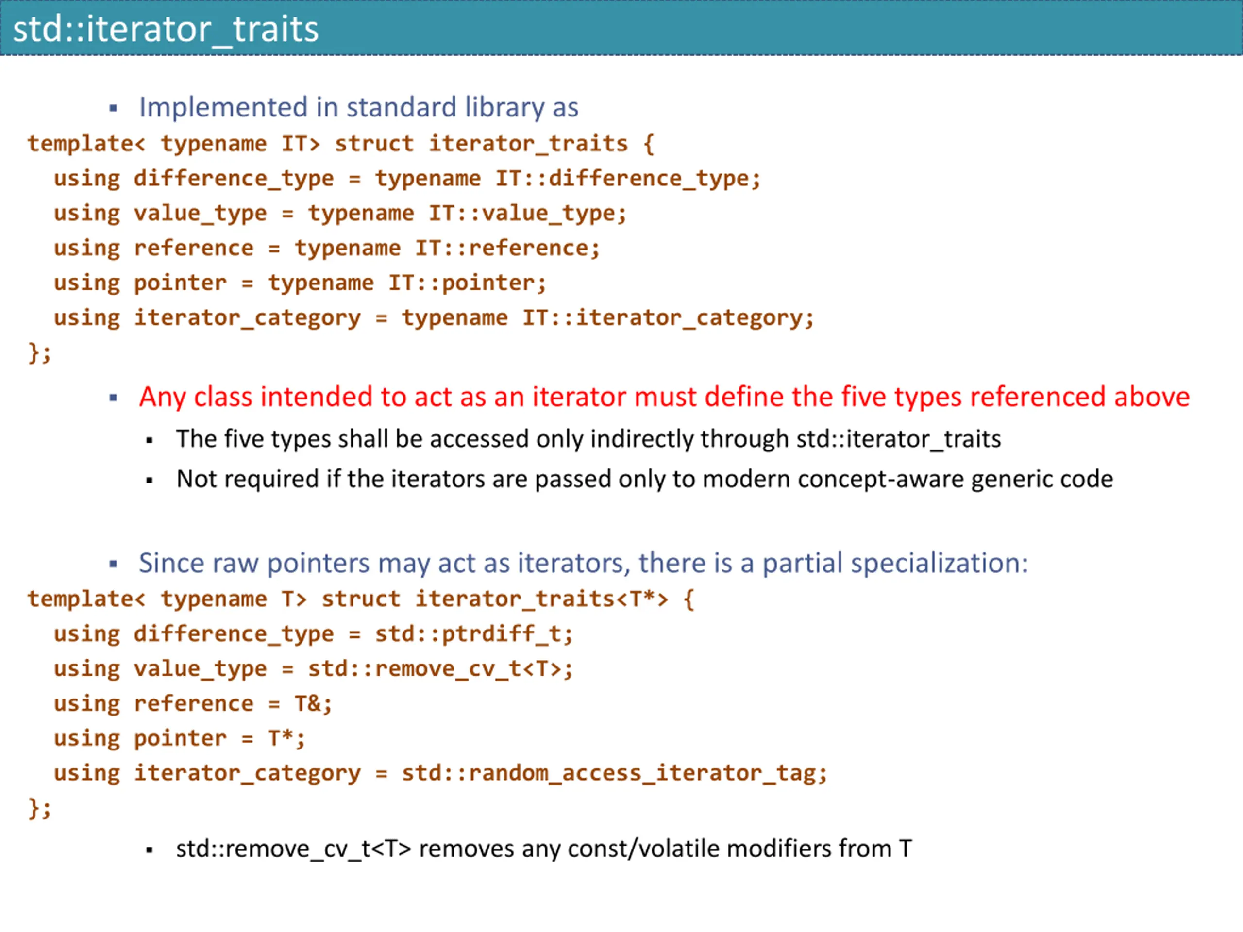 std::iterator_traits Implemented in standard library as template< typename IT> struct iterator_traits { using difference_type = typename IT::difference_type; using value_type = typename IT::value_type; using reference = typename IT::reference; using pointer = typename IT::pointer; using iterator_category = typename IT::iterator_category; }; Any class intended to act as an iterator must define the five types referenced above The five types shall be accessed only indirectly through std::iterator_traits Not required if the iterators are passed only to modern concept-aware generic code Since raw pointers may act as iterators, there is a partial specialization: template< typename T> struct iterator_traits<T*> { using difference_type = std::ptrdiff_t; using value_type = std::remove_cv_t<T>; using reference = T&; using pointer = T*; using iterator_category = std::random_access_iterator_tag; }; std::remove_cv_t<T> removes any const/volatile modifiers from T