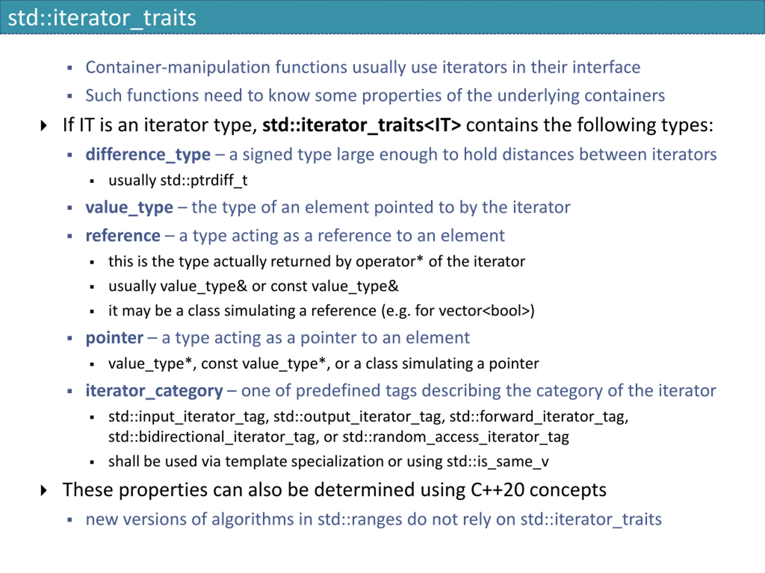 std::iterator_traits Container-manipulation functions usually use iterators in their interface Such functions need to know some properties of the underlying containers If IT is an iterator type, std::iterator_traits<IT> contains the following types: difference_type a signed type large enough to hold distances between iterators usually std::ptrdiff_t value_type the type of an element pointed to by the iterator reference a type acting as a reference to an element this is the type actually returned by operator* of the iterator usually value_type& or const value_type& it may be a class simulating a reference (e.g. for vector<bool>) pointer a type acting as a pointer to an element value_type*, const value_type*, or a class simulating a pointer iterator_category one of predefined tags describing the category of the iterator std::input_iterator_tag, std::output_iterator_tag, std::forward_iterator_tag, std::bidirectional_iterator_tag, or std::random_access_iterator_tag shall be used via template specialization or using std::is_same_v These properties can also be determined using C++20 concepts new versions of algorithms in std::ranges do not rely on std::iterator_traits
