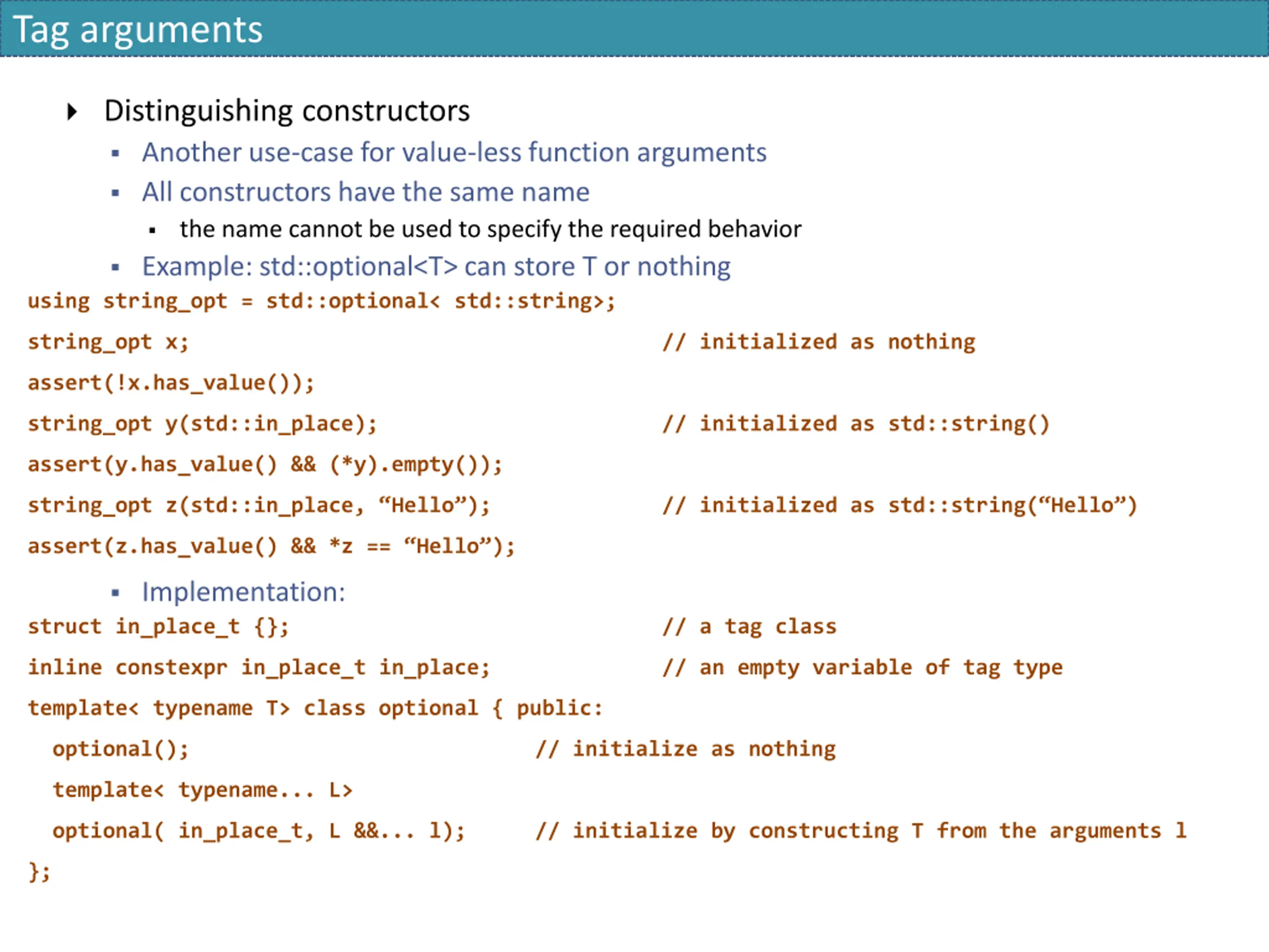 Tag arguments Distinguishing constructors Another use-case for value-less function arguments All constructors have the same name the name cannot be used to specify the required behavior Example: std::optional<T> can store T or nothing using string_opt = std::optional< std::string>; string_opt x; // initialized as nothing assert(!x.has_value()); string_opt y(std::in_place); // initialized as std::string() assert(y.has_value() && (*y).empty()); string_opt z(std::in_place, Hello ); // initialized as std::string( Hello ) assert(z.has_value() && *z == Hello ); Implementation: struct in_place_t {}; // a tag class inline constexpr in_place_t in_place; // an empty variable of tag type template< typename T> class optional { public: optional(); // initialize as nothing template< typename... L> optional( in_place_t, L &&... l); // initialize by constructing T from the arguments l };