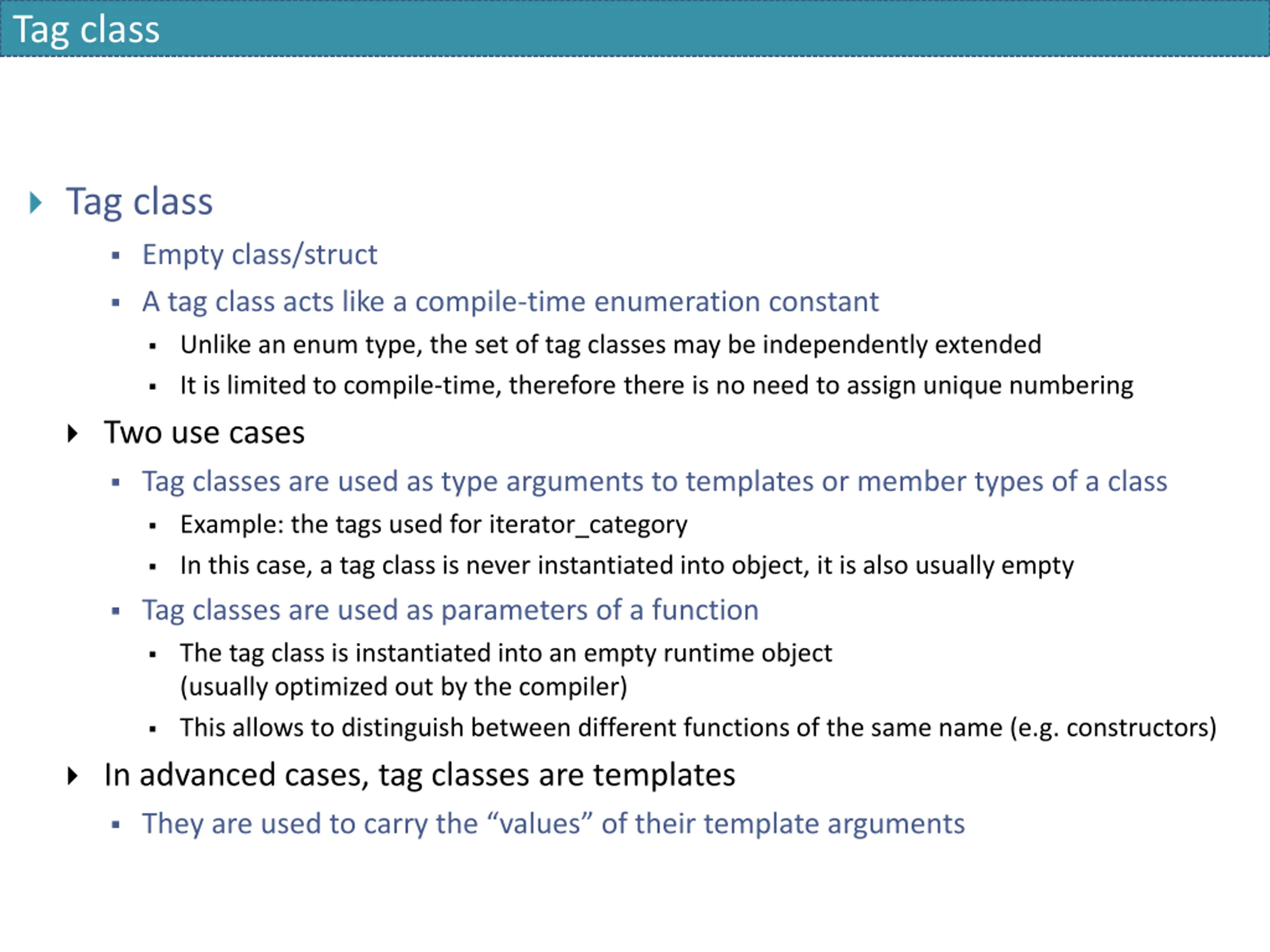 Tag class Tag class Empty class/struct A tag class acts like a compile-time enumeration constant Unlike an enum type, the set of tag classes may be independently extended It is limited to compile-time, therefore there is no need to assign unique numbering Two use cases Tag classes are used as type arguments to templates or member types of a class Example: the tags used for iterator_category In this case, a tag class is never instantiated into object, it is also usually empty Tag classes are used as parameters of a function The tag class is instantiated into an empty runtime object (usually optimized out by the compiler) This allows to distinguish between different functions of the same name (e.g. constructors) In advanced cases, tag classes are templates They are used to carry the values of their template arguments