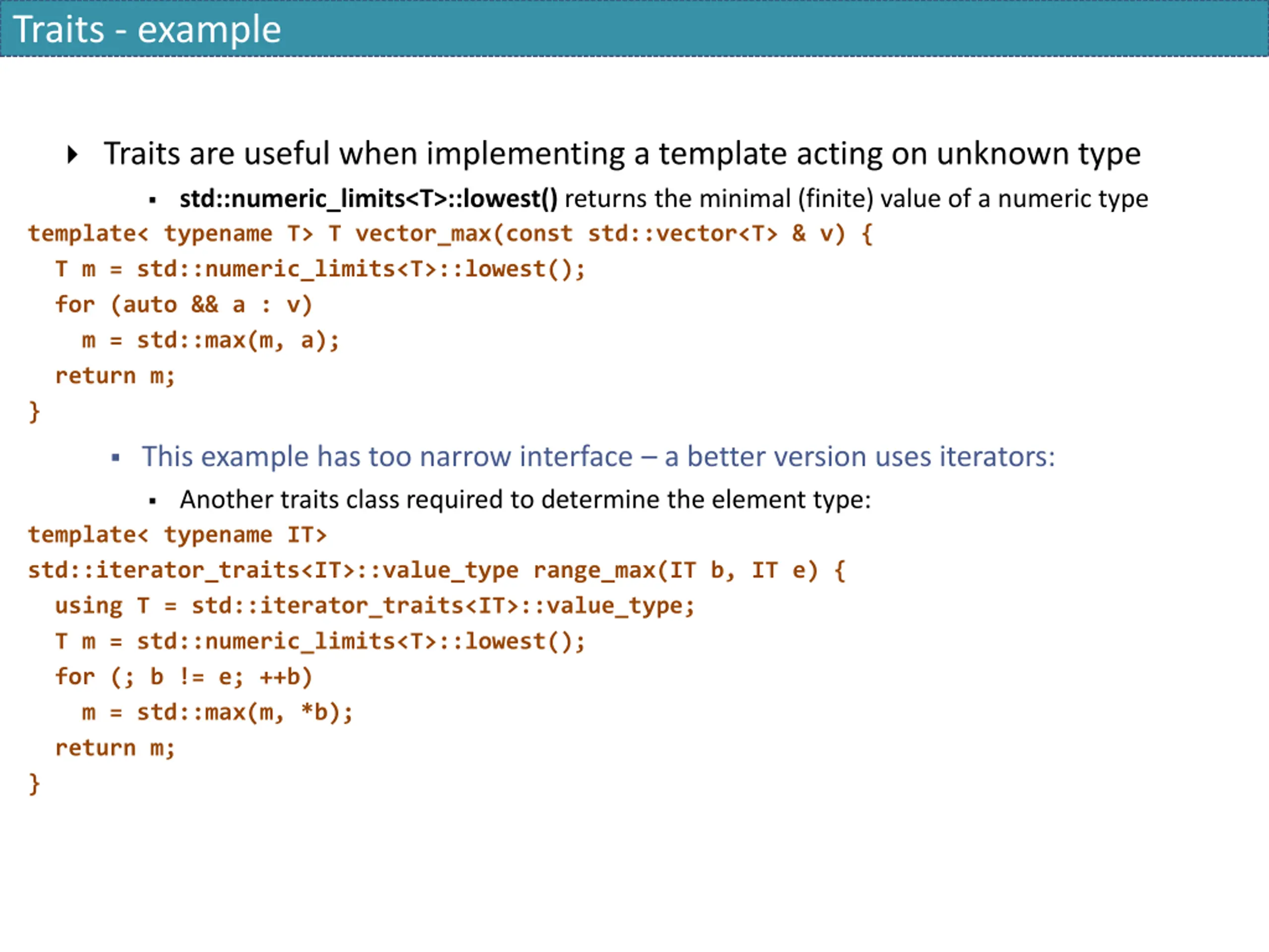 Traits - example Traits are useful when implementing a template acting on unknown type std::numeric_limits<T>::lowest() returns the minimal (finite) value of a numeric type template< typename T> T vector_max(const std::vector<T> & v) { T m = std::numeric_limits<T>::lowest(); for (auto && a : v) m = std::max(m, a); return m; } This example has too narrow interface a better version uses iterators: Another traits class required to determine the element type: template< typename IT> std::iterator_traits<IT>::value_type range_max(IT b, IT e) { using T = std::iterator_traits<IT>::value_type; T m = std::numeric_limits<T>::lowest(); for (; b != e; ++b) m = std::max(m, *b); return m; }