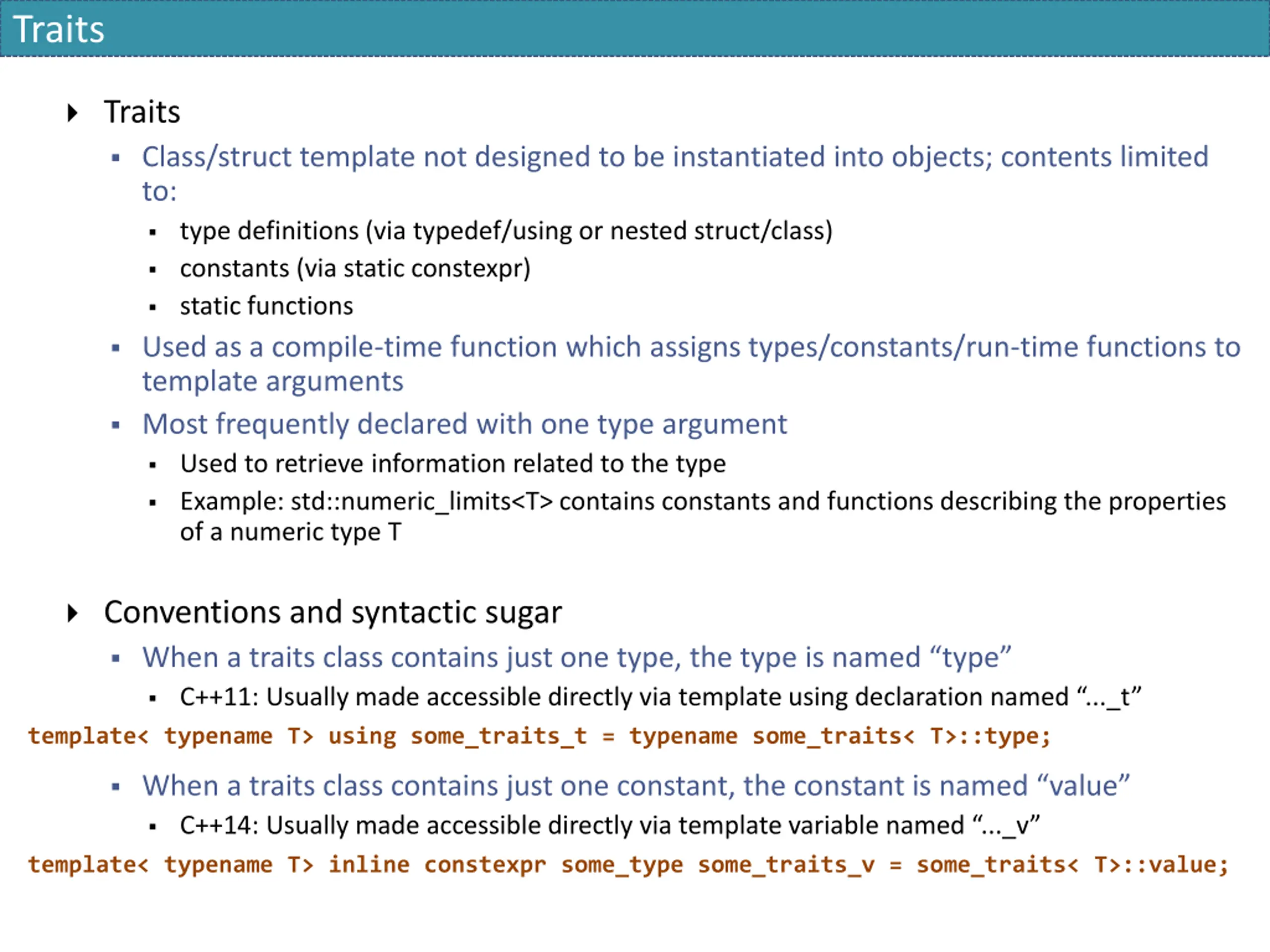 Traits Traits Class/struct template not designed to be instantiated into objects; contents limited to: type definitions (via typedef/using or nested struct/class) constants (via static constexpr) static functions Used as a compile-time function which assigns types/constants/run-time functions to template arguments Most frequently declared with one type argument Used to retrieve information related to the type Example: std::numeric_limits<T> contains constants and functions describing the properties of a numeric type T Conventions and syntactic sugar When a traits class contains just one type, the type is named type C++11: Usually made accessible directly via template using declaration named ..._t template< typename T> using some_traits_t = typename some_traits< T>::type; When a traits class contains just one constant, the constant is named value C++14: Usually made accessible directly via template variable named ..._v template< typename T> inline constexpr some_type some_traits_v = some_traits< T>::value;