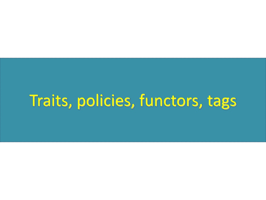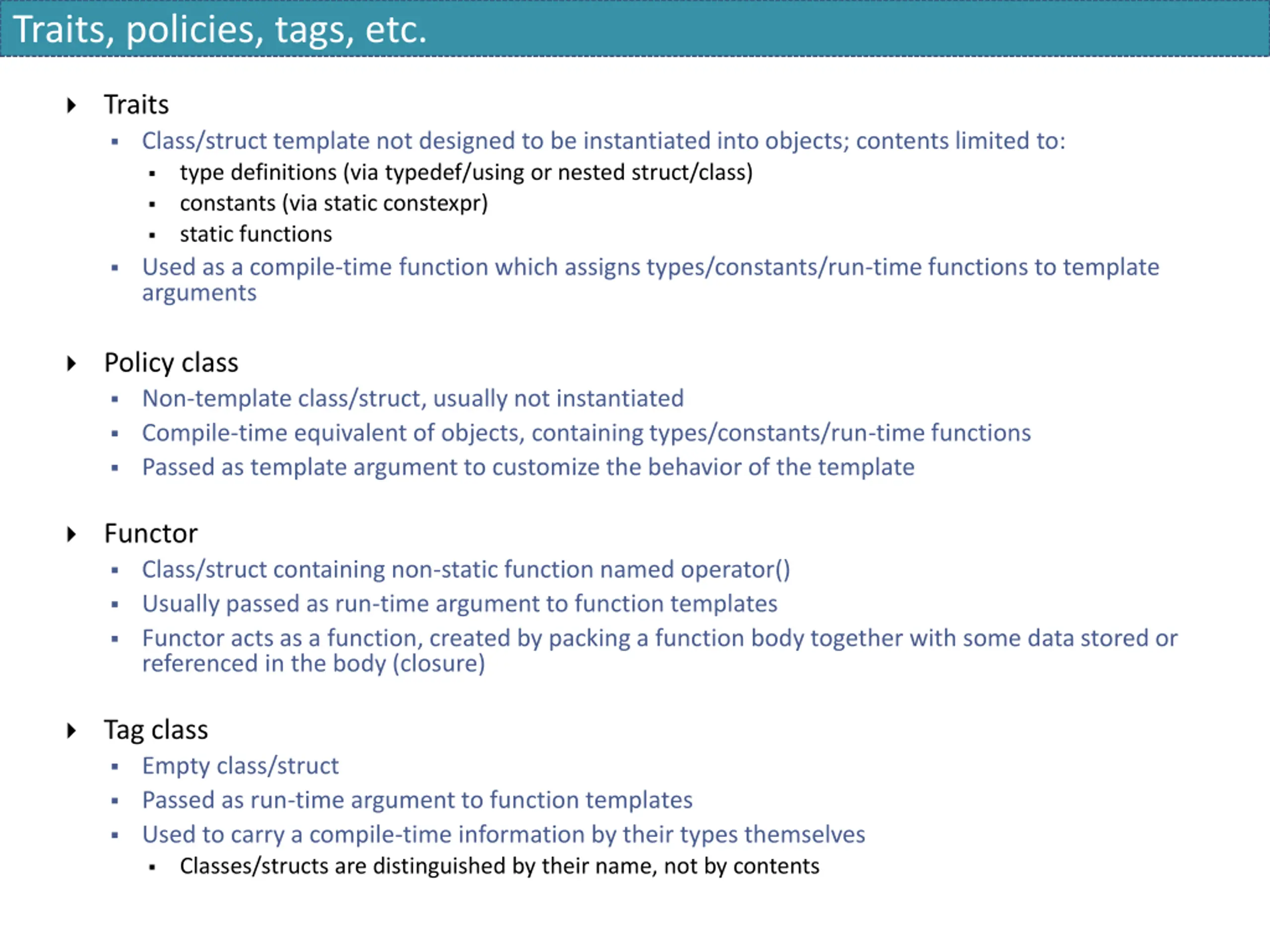 Traits, policies, tags, etc. Traits Class/struct template not designed to be instantiated into objects; contents limited to: type definitions (via typedef/using or nested struct/class) constants (via static constexpr) static functions Used as a compile-time function which assigns types/constants/run-time functions to template arguments Policy class Non-template class/struct, usually not instantiated Compile-time equivalent of objects, containing types/constants/run-time functions Passed as template argument to customize the behavior of the template Functor Class/struct containing non-static function named operator() Usually passed as run-time argument to function templates Functor acts as a function, created by packing a function body together with some data stored or referenced in the body (closure) Tag class Empty class/struct Passed as run-time argument to function templates Used to carry a compile-time information by their types themselves Classes/structs are distinguished by their name, not by contents