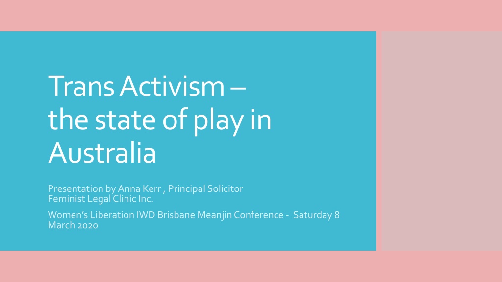 Trans Activism the state of play in Australia Presentation by Anna Kerr , Principal Solicitor Feminist Legal Clinic Inc. Women s Liberation IWD Brisbane MeanjinConference - Saturday 8 March 2020