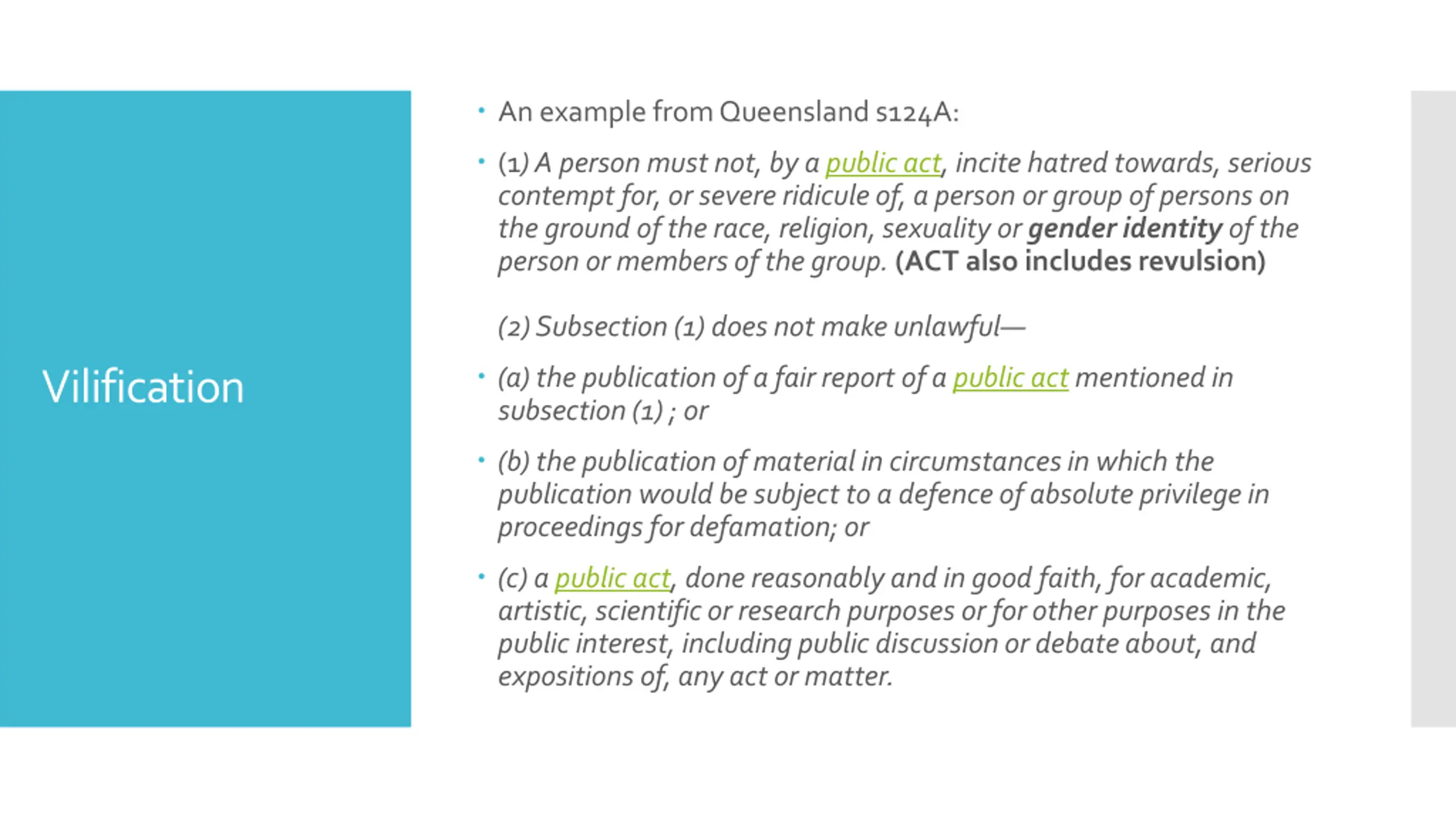 An example from Queensland s124A: (1) A person must not, by a public act, incite hatred towards, serious contempt for, or severe ridicule of, a person or group of persons on the ground of the race, religion, sexuality or gender identity of the person or members of the group. (ACT also includes revulsion) (2) Subsection (1) does not make unlawful (a) the publication of a fair report of a public act mentioned in subsection(1) ; or Vilification (b) the publication of material in circumstances in which the publication would be subject to a defence of absolute privilege in proceedings for defamation; or (c) a public act, done reasonably and in good faith, for academic, artistic, scientific or research purposes or for other purposes in the public interest, including public discussion or debate about, and expositions of, any act or matter.