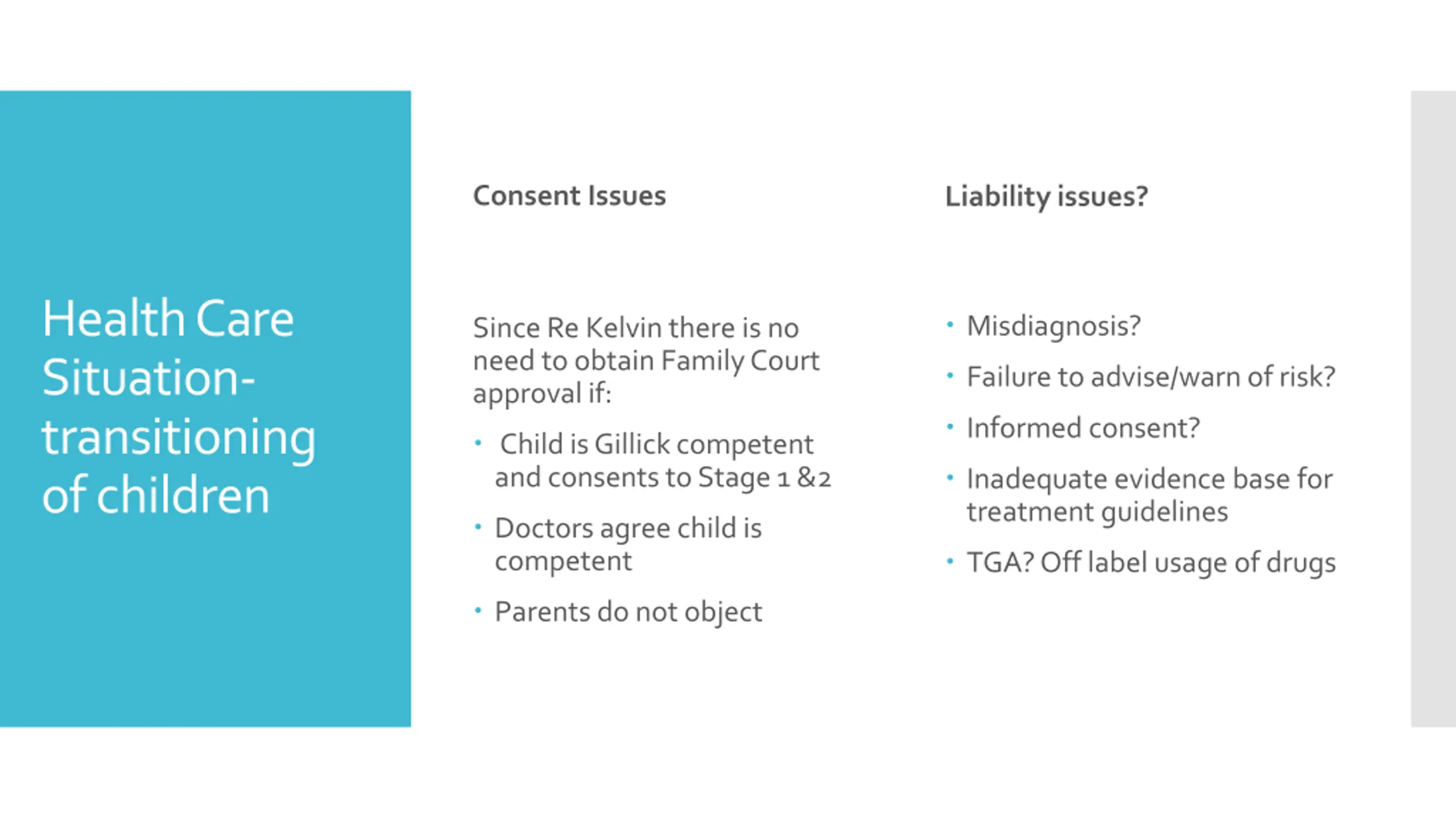 Consent Issues Liability issues? Health Care Situation- transitioning of children Misdiagnosis? Since Re Kelvin there is no need to obtain Family Court approval if: Failure to advise/warn of risk? Informed consent? Child is Gillick competent and consents to Stage 1 &2 Inadequate evidence base for treatment guidelines Doctors agree child is competent TGA? Off label usage of drugs Parents do not object