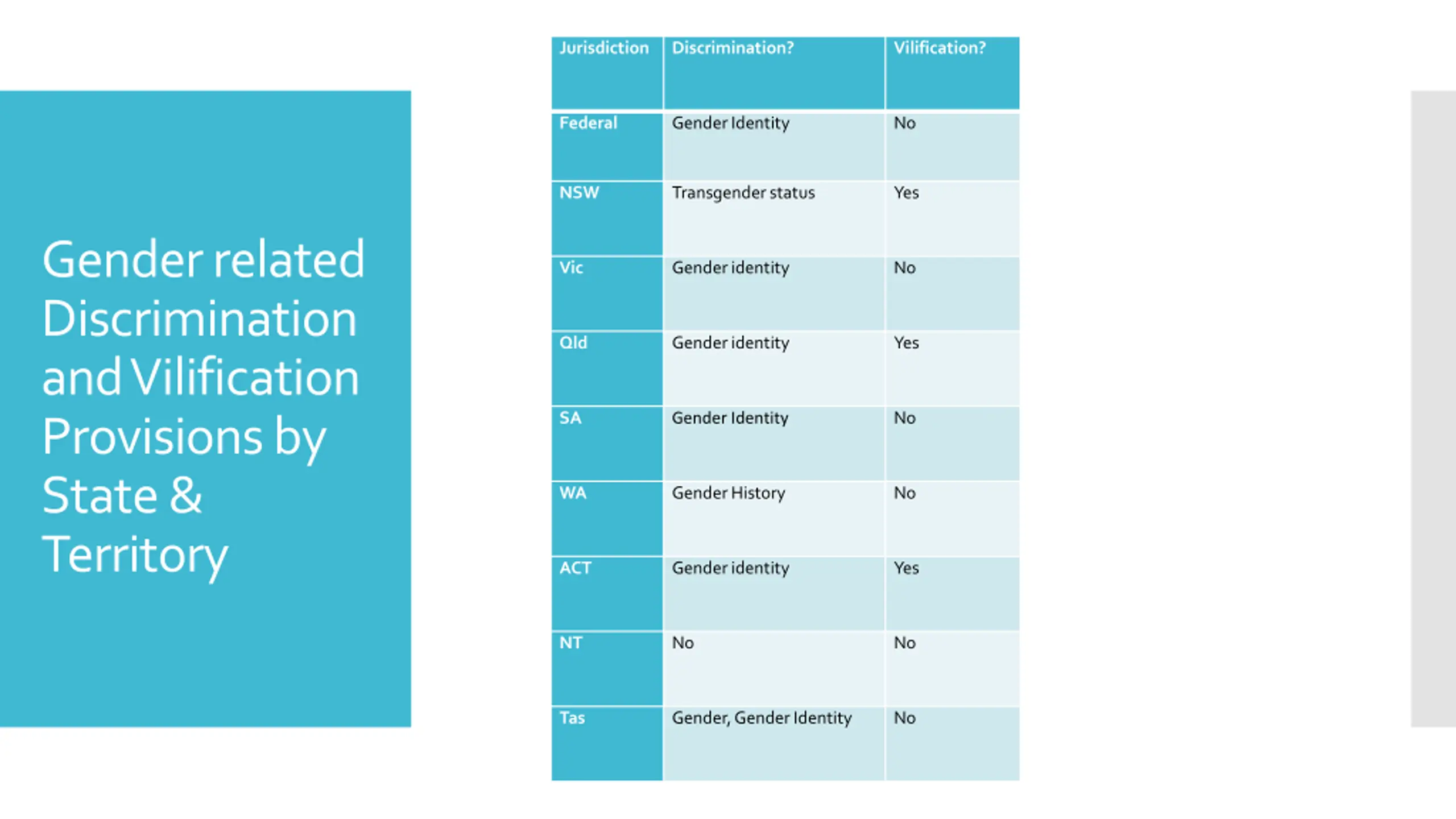 Jurisdiction Discrimination? Vilification? Federal Gender Identity No NSW Transgender status Yes Gender related Discrimination and Vilification Provisions by State & Territory Vic Gender identity No Qld Gender identity Yes Gender Identity SA No WA Gender History No ACT Gender identity Yes NT No No Tas Gender, Gender Identity No
