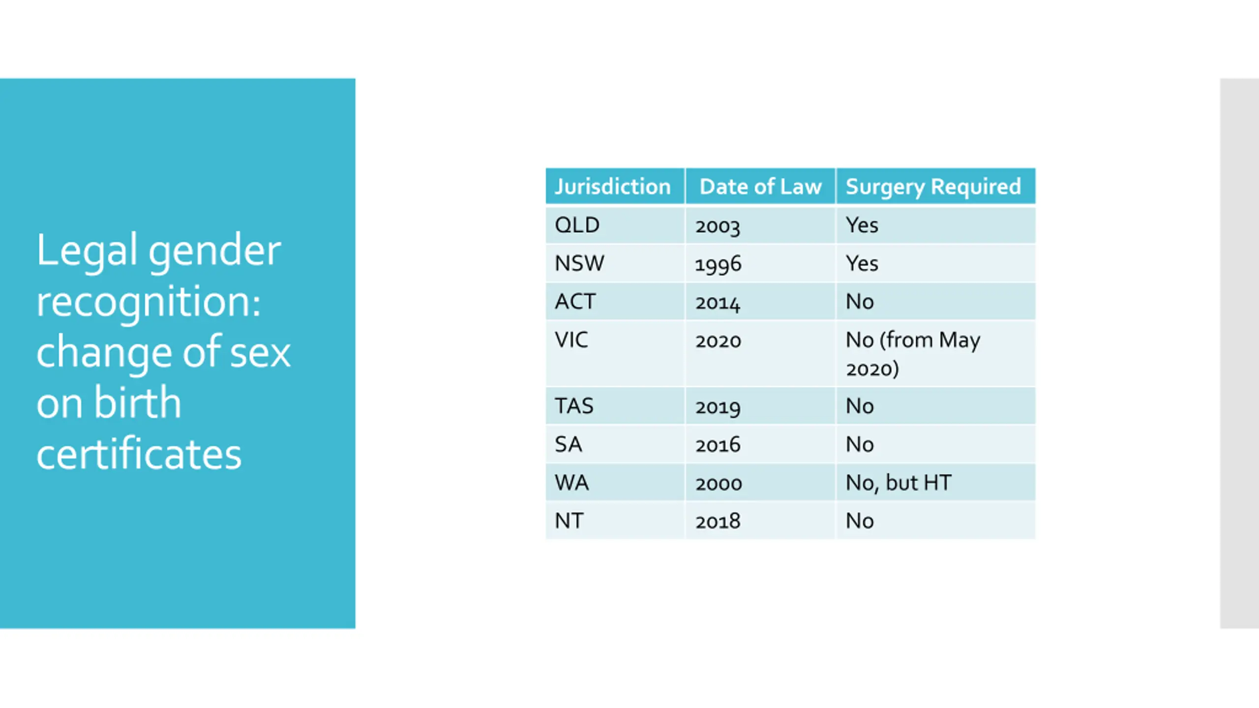 Jurisdiction Date of Law Surgery Required QLD 2003 Yes Legal gender recognition: change of sex on birth certificates NSW 1996 Yes ACT 2014 No VIC 2020 No (from May 2020) TAS 2019 No SA 2016 No WA 2000 No, but HT NT 2018 No