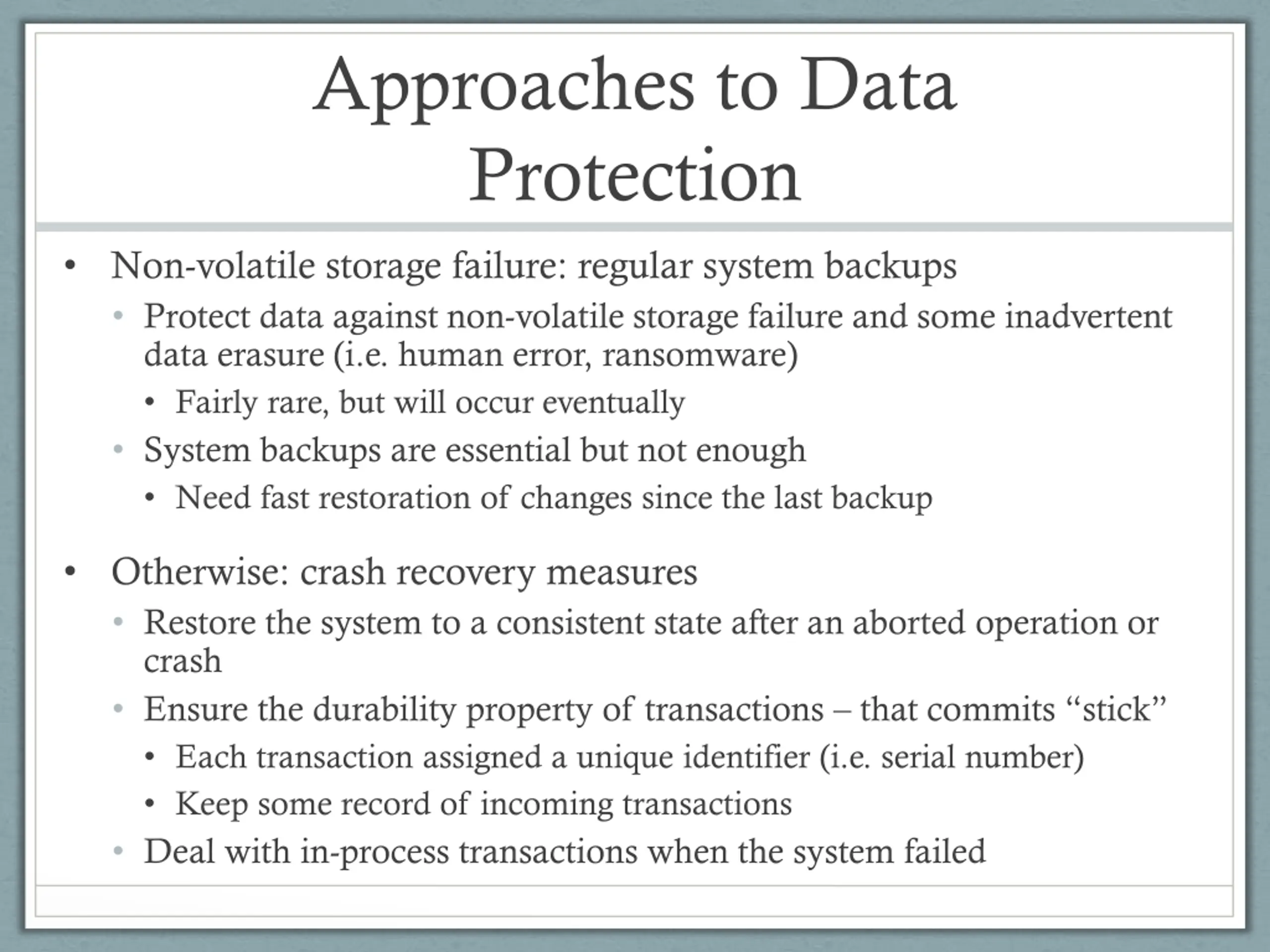 Approaches to Data Protection Non-volatile storage failure: regular system backups Protect data against non-volatile storage failure and some inadvertent data erasure (i.e. human error, ransomware) Fairly rare, but will occur eventually System backups are essential but not enough Need fast restoration of changes since the last backup Otherwise: crash recovery measures Restore the system to a consistent state after an aborted operation or crash Ensure the durability property of transactions that commits stick Each transaction assigned a unique identifier (i.e. serial number) Keep some record of incoming transactions Deal with in-process transactions when the system failed