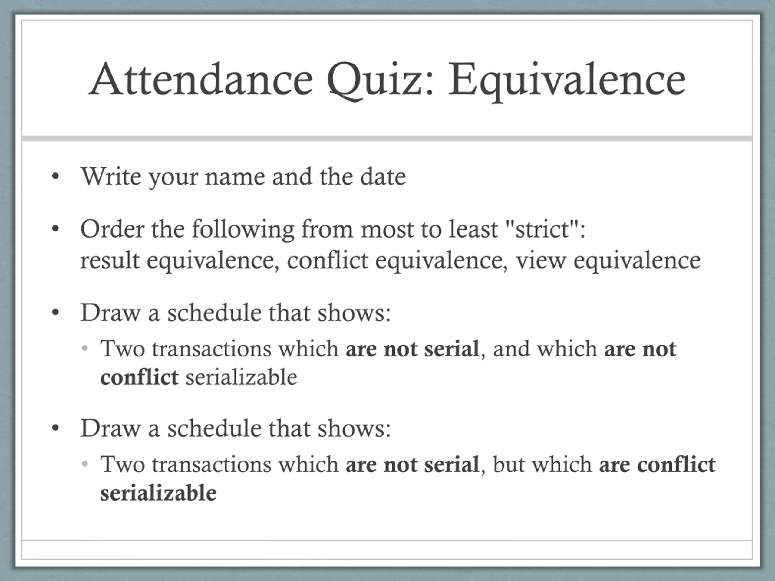 Attendance Quiz: Equivalence Write your name and the date Order the following from most to least "strict": result equivalence, conflict equivalence, view equivalence Draw a schedule that shows: Two transactions which are not serial, and which are not conflict serializable Draw a schedule that shows: Two transactions which are not serial, but which are conflict serializable