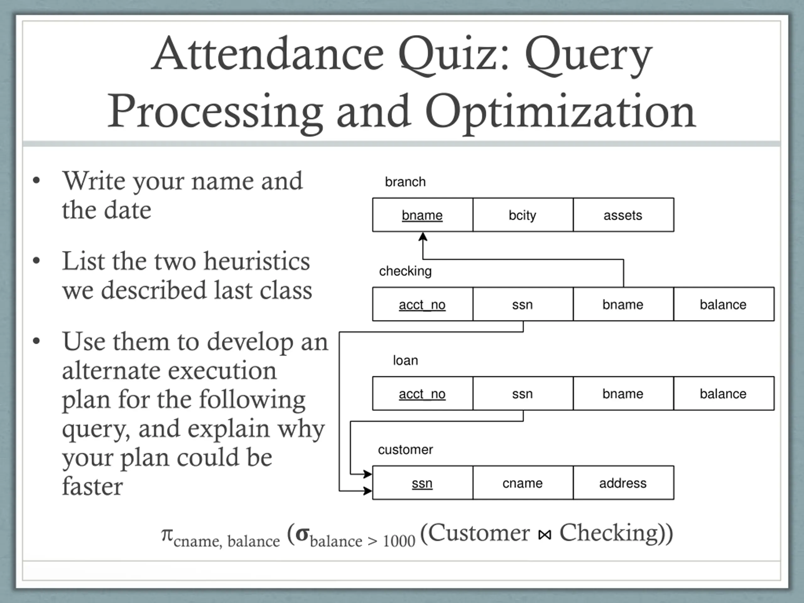Attendance Quiz: Query Processing and Optimization Write your name and the date branch bname bcity assets List the two heuristics we described last class checking acct_no ssn bname balance Use them to develop an alternate execution plan for the following query, and explain why your plan could be faster loan acct_no ssn bname balance customer ssn cname address cname, balance ( balance > 1000 (Customer Checking))