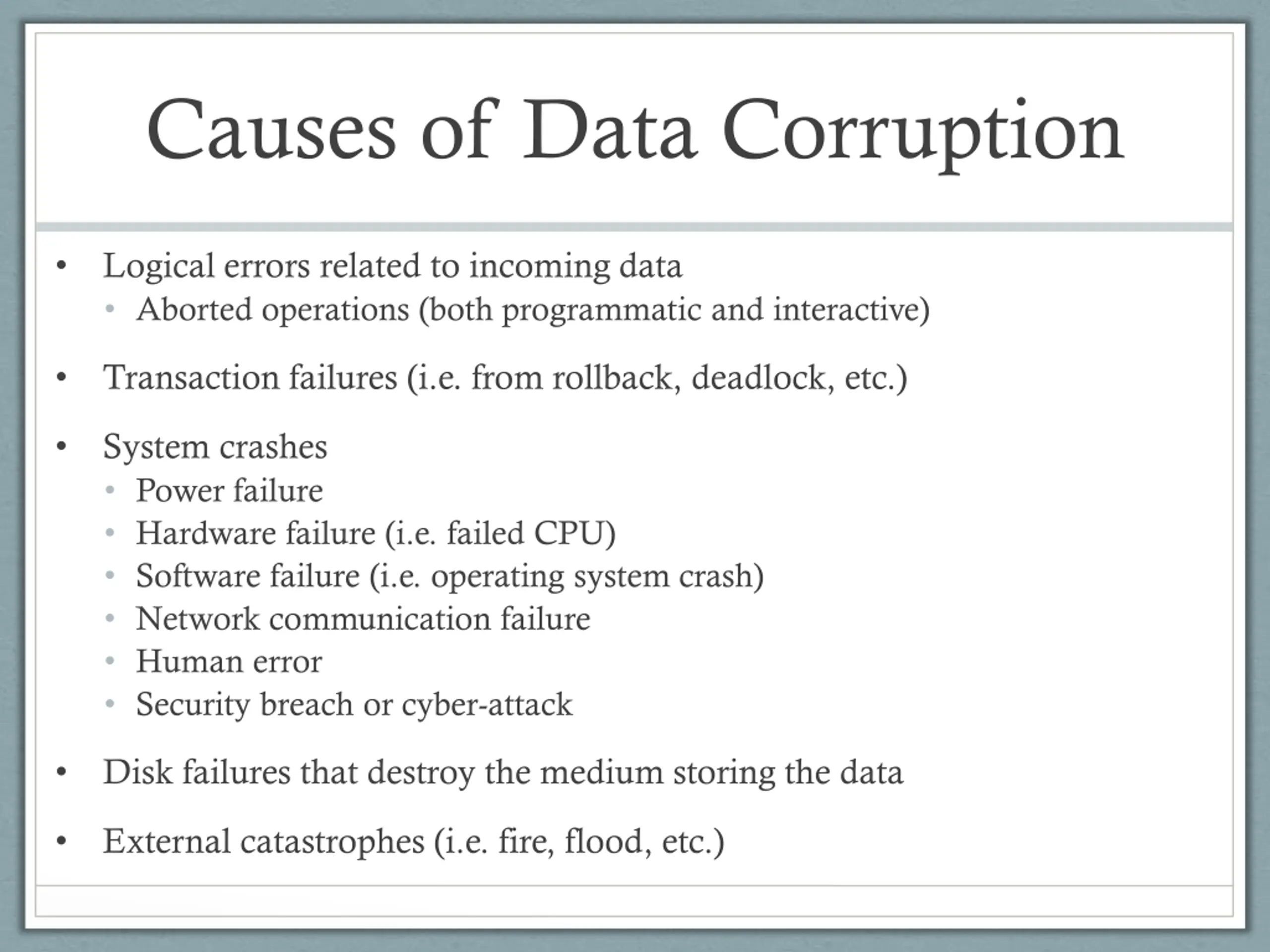 Causes of Data Corruption Logical errors related to incoming data Aborted operations (both programmatic and interactive) Transaction failures (i.e. from rollback, deadlock, etc.) System crashes Power failure Hardware failure (i.e. failed CPU) Software failure (i.e. operating system crash) Network communication failure Human error Security breach or cyber-attack Disk failures that destroy the medium storing the data External catastrophes (i.e. fire, flood, etc.)