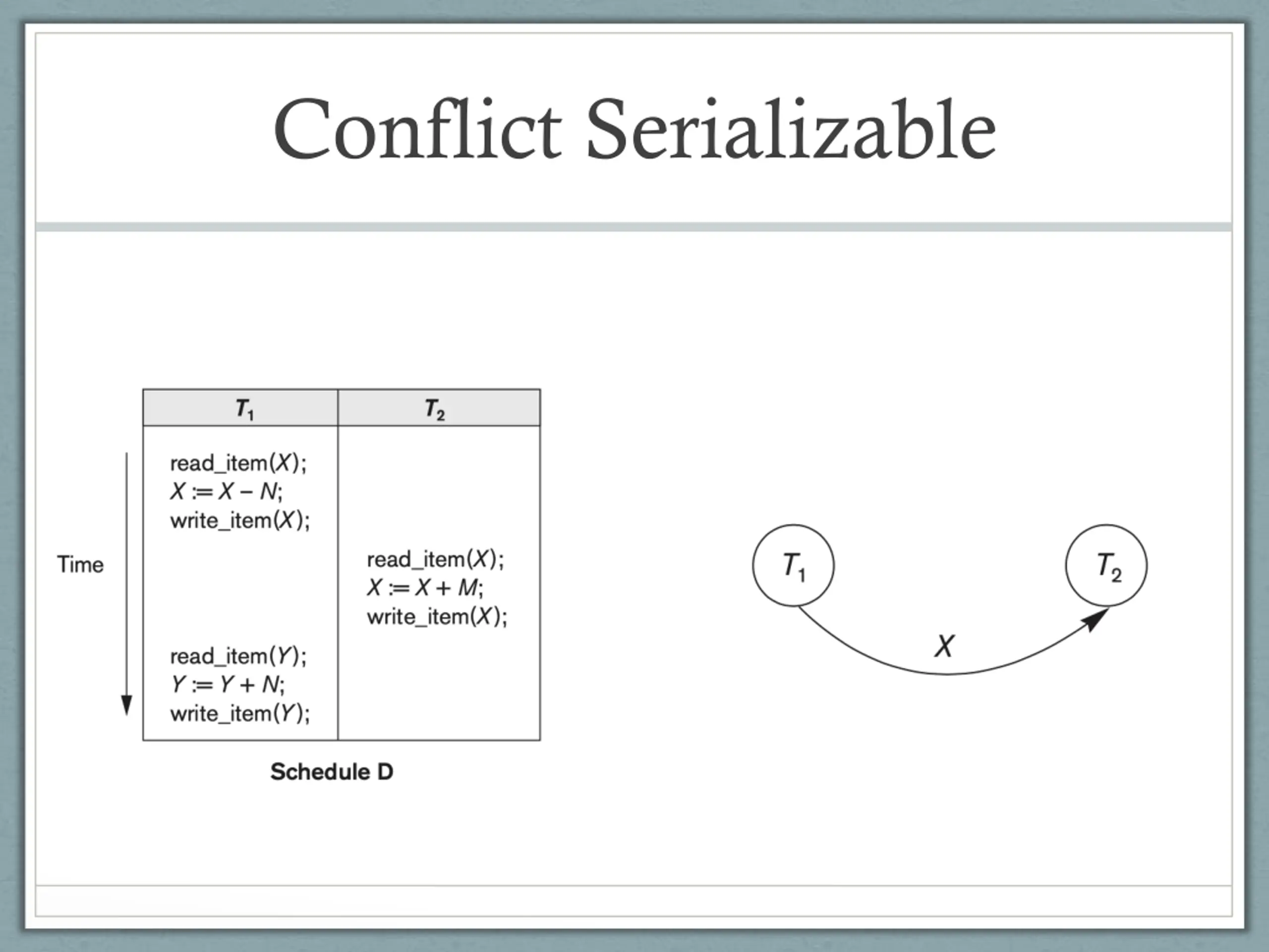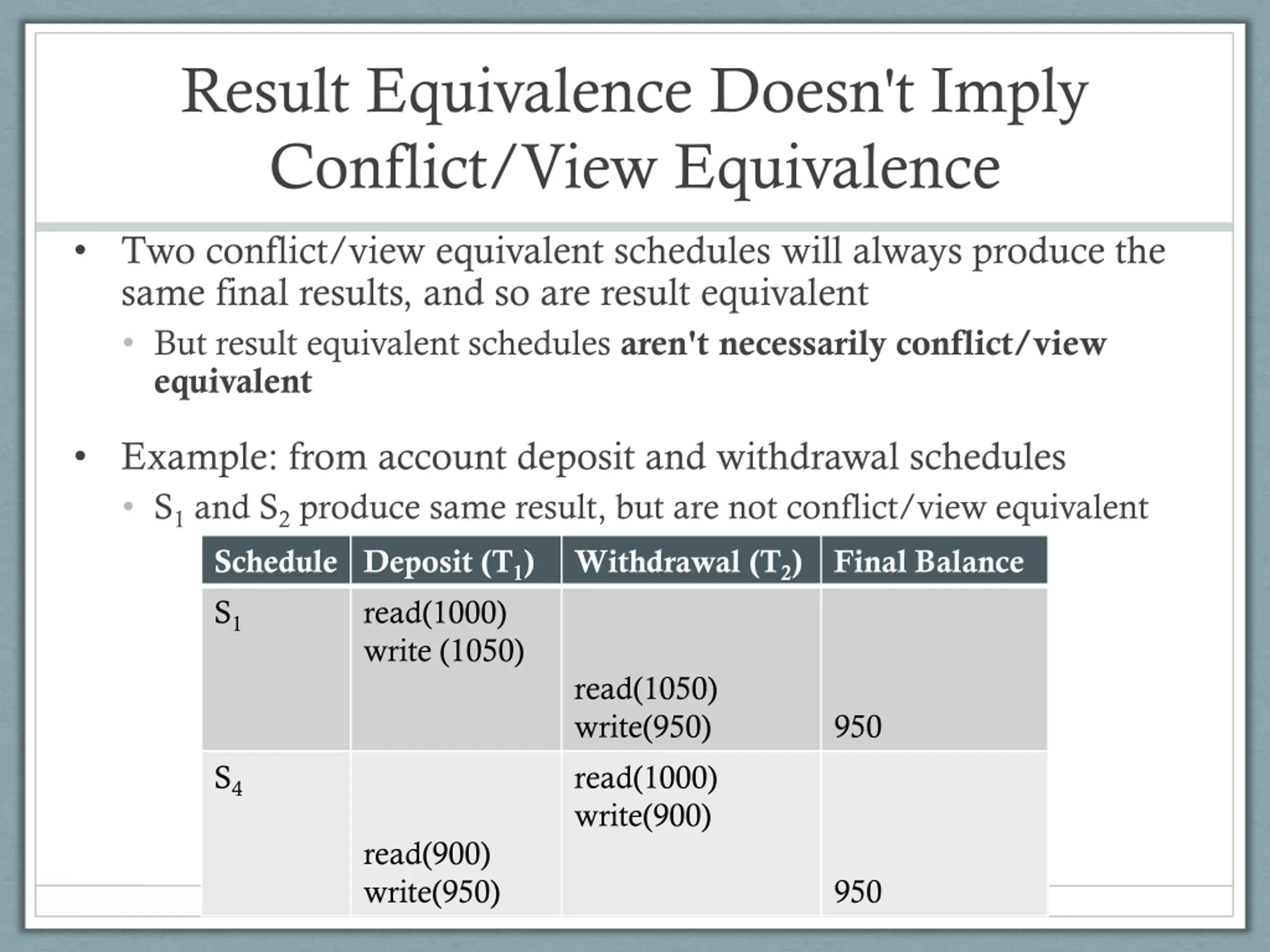 Result Equivalence Doesn't Imply Conflict/View Equivalence Two conflict/view equivalent schedules will always produce the same final results, and so are result equivalent But result equivalent schedules aren't necessarily conflict/view equivalent Example: from account deposit and withdrawal schedules S1 and S2 produce same result, but are not conflict/view equivalent Schedule Deposit (T1) Withdrawal (T2) S1 read(1000) write (1050) read(1050) write(950) S4 read(1000) write(900) Final Balance 950 read(900) write(950) 950