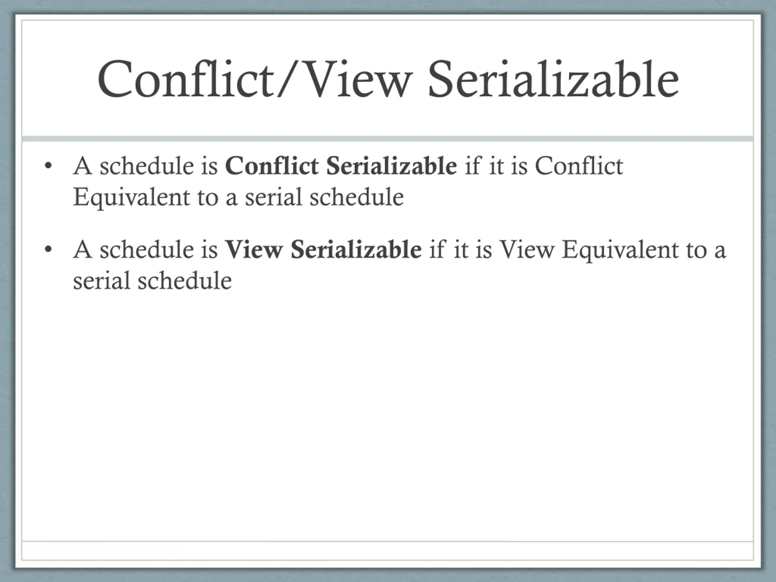 Conflict/View Serializable A schedule is Conflict Serializable if it is Conflict Equivalent to a serial schedule A schedule is View Serializable if it is View Equivalent to a serial schedule
