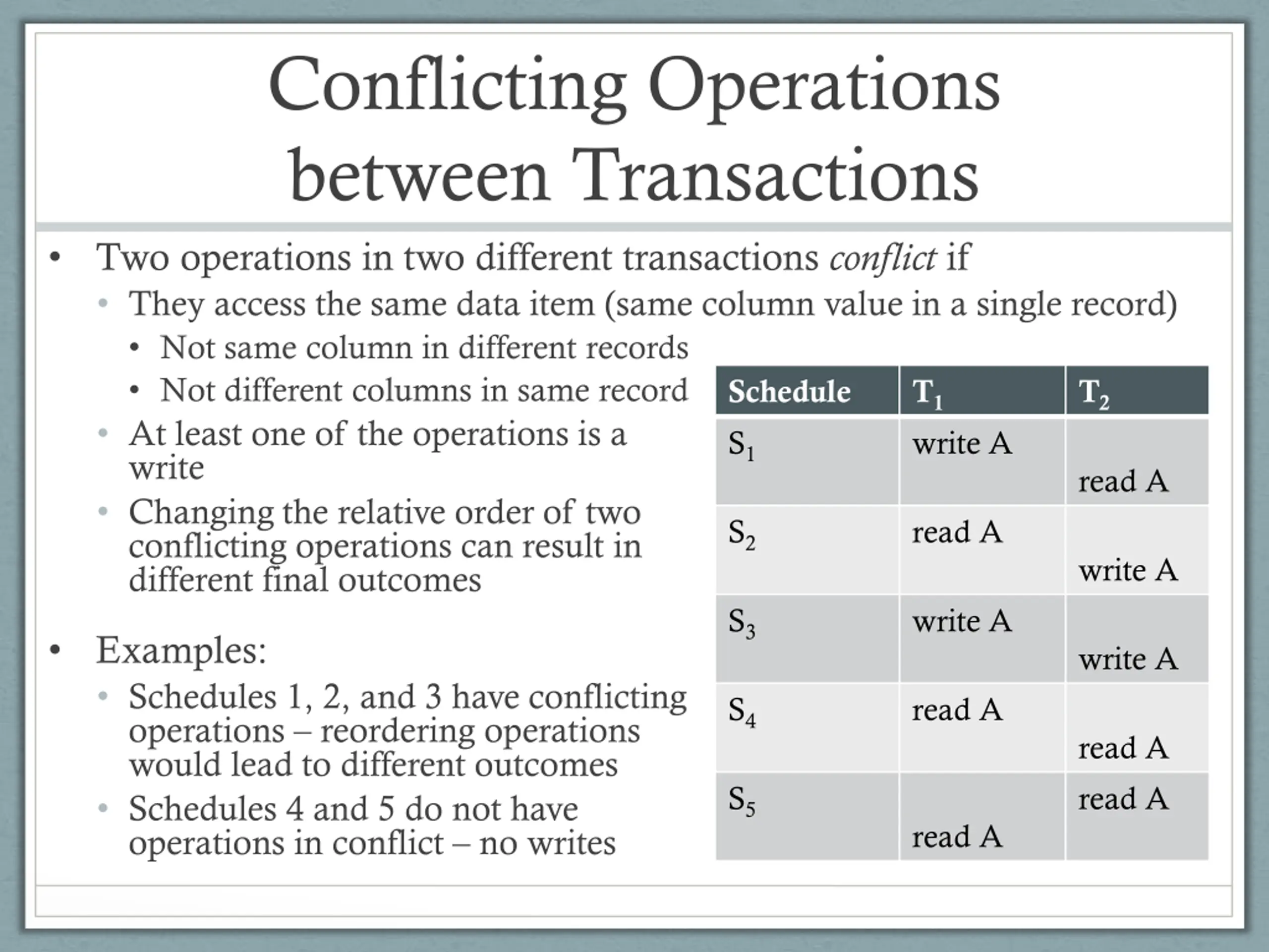 Conflicting Operations between Transactions Two operations in two different transactions conflict if They access the same data item (same column value in a single record) Not same column in different records Not different columns in same record At least one of the operations is a write Changing the relative order of two conflicting operations can result in different final outcomes Schedule S1 T1 write A T2 read A S2 read A write A S3 write A Examples: Schedules 1, 2, and 3 have conflicting operations reordering operations would lead to different outcomes Schedules 4 and 5 do not have operations in conflict no writes write A S4 read A read A read A S5 read A