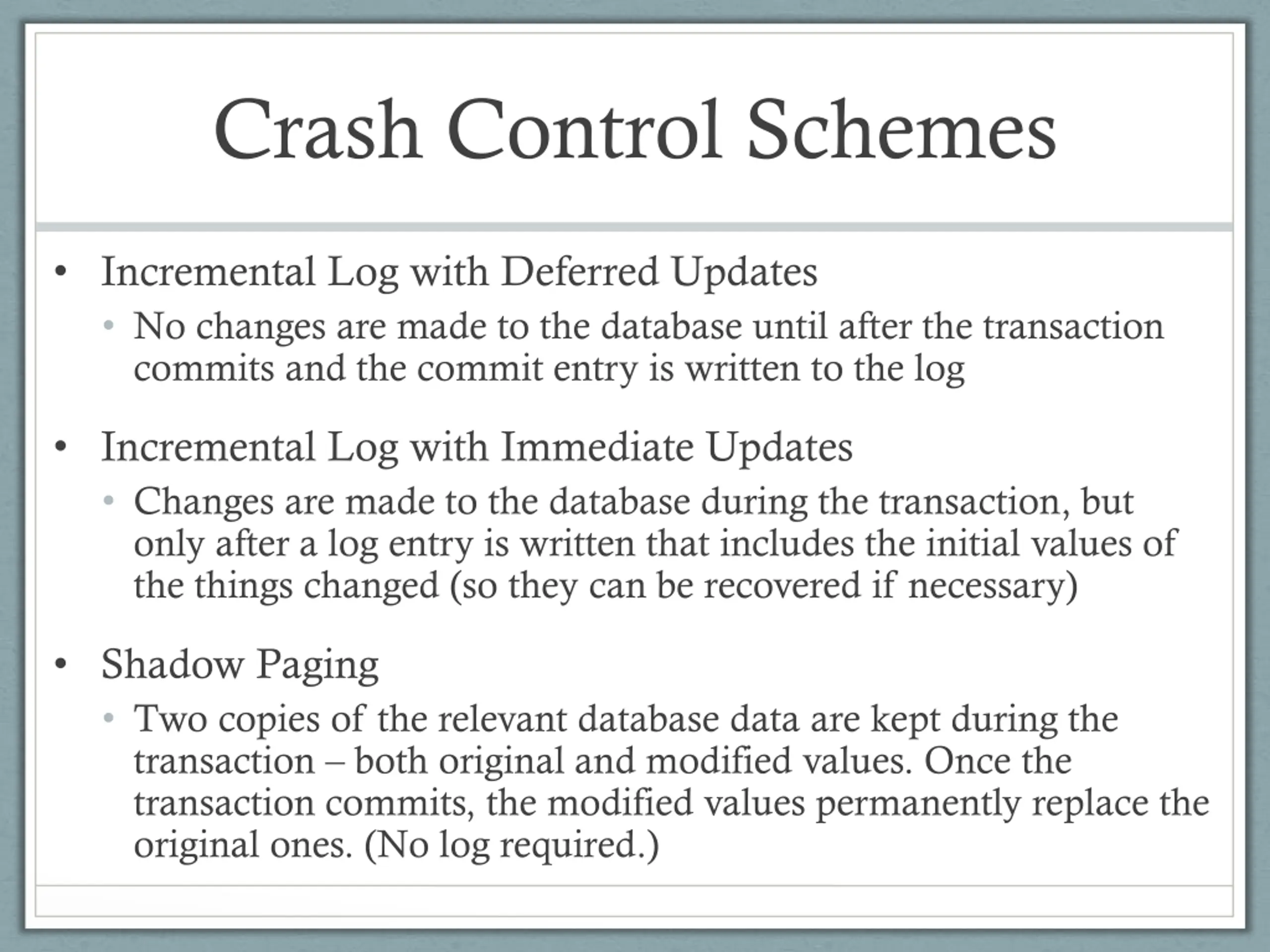 Crash Control Schemes Incremental Log with Deferred Updates No changes are made to the database until after the transaction commits and the commit entry is written to the log Incremental Log with Immediate Updates Changes are made to the database during the transaction, but only after a log entry is written that includes the initial values of the things changed (so they can be recovered if necessary) Shadow Paging Two copies of the relevant database data are kept during the transaction both original and modified values. Once the transaction commits, the modified values permanently replace the original ones. (No log required.)